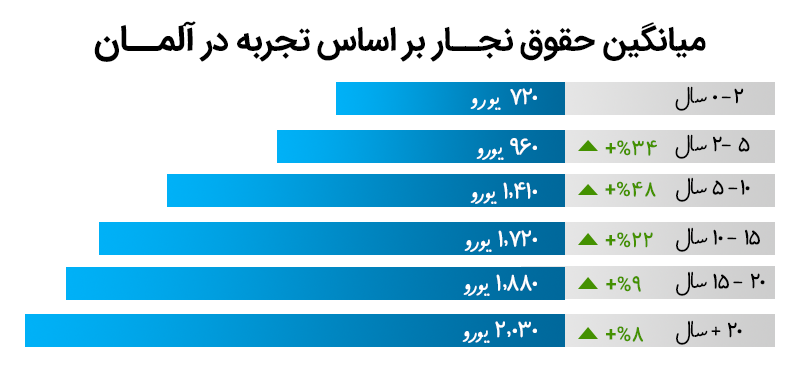 زمانی که آموزشهای شما به پایان میرسد، آماده ورود به بازار کار هستید. وضعیت درآمد متوسط نجاران پس از اتمام آوسبیلدونگ نجاری آلمان بهصورت زیر است: