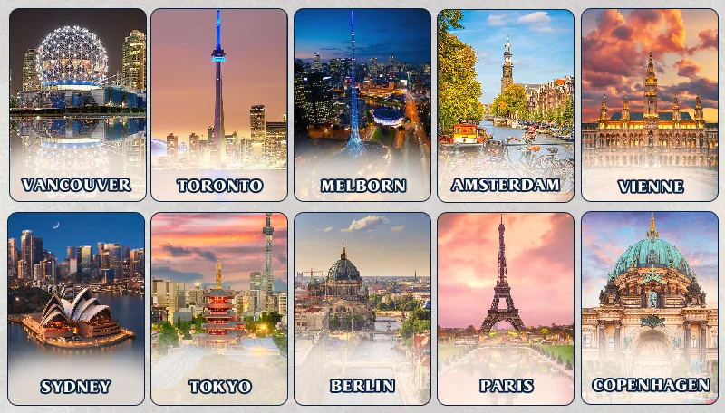 در ادامه لیست نعدادی از بهترین شهرهای دنیا برای زندگی در سال 2024، بر اساس آمار سایت Finance.yahoo را لیست کرده‌ایم. (این سایت برترین شهرها را بر اساس سه گزارش “بهترین شهرهای جهان برای زندگی Global Finance در 2022، بررسی کیفیت زندگی Monocle در 2022، و رتبه بندی کیفیت زندگی Mercer در سال 2019” لیست شده است.)