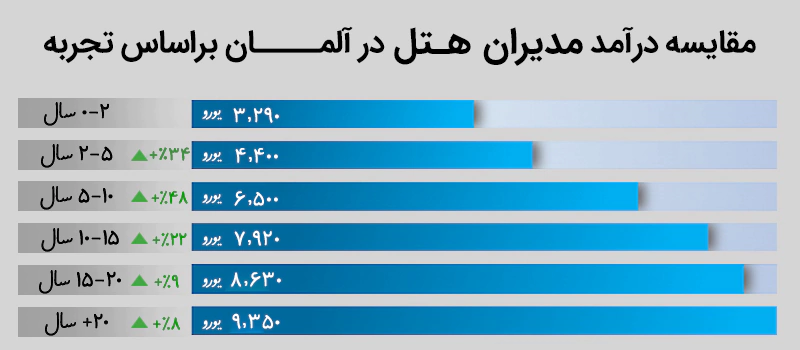 مانند هر شغل دیگری، درآمد رشته هتلداری در آلمان نیز میتواند بسته به میزان تجربه، جنسیت، مهارتها، تحصیلات و … متفاوت باشد. برای مثال، درآمد یک مدیر هتل با دو سال تجربه، قطعاً نسبت به فردی با شرایط یکسان اما تجربه بیشتر، پایینتر خواهد بود. در نمودار زیر میتوانید میزان درآمد افراد بسته به میزان تجربه را با هم مقایسه کنید.