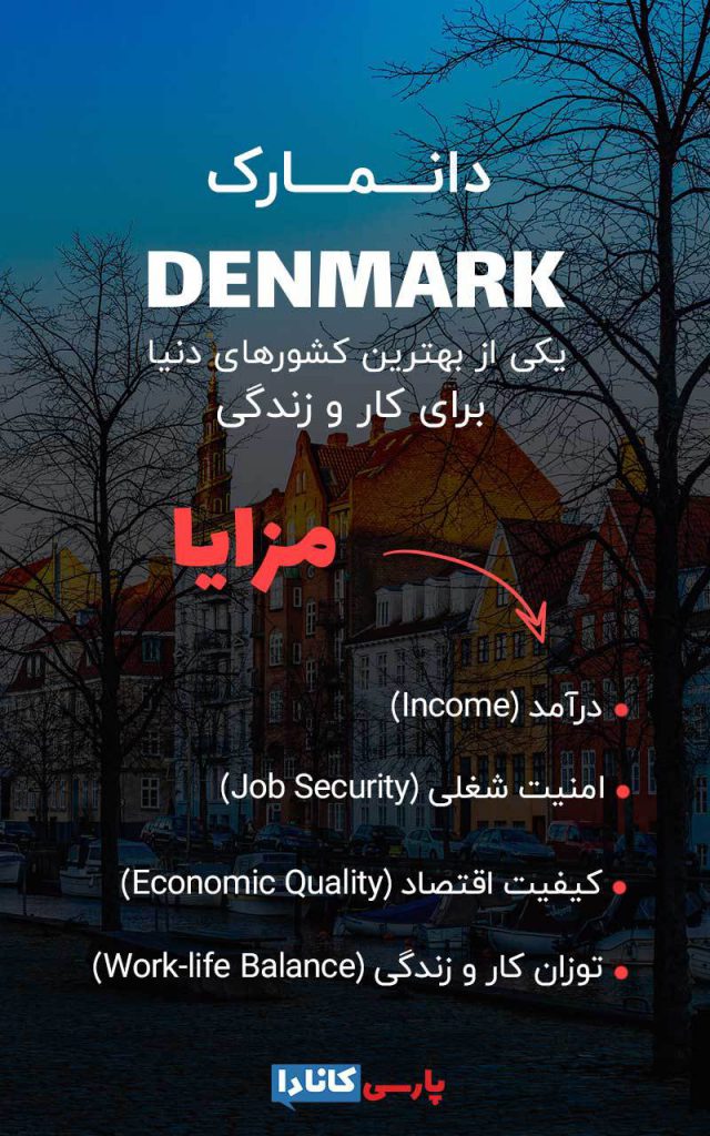 شاخص‌های کیفیت اقتصاد (Economic Quality)، درآمد (Income)، امنیت شغلی (Job Security) و توازن کار و زندگی (Work-Life Balance) در دانمارک بسیار بالاست. این کشور جز بهترین کشورها برای کار برای ایرانیان است.