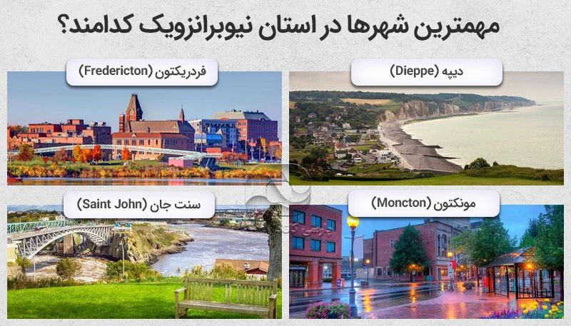 مهم‌ترین شهرهافردریکتون (Fredericton)، مونکتون (Moncton)، سنت جان (Saint John)، دیپه (Dieppe)، ریورویو (Riverview)