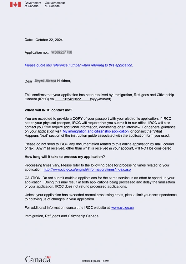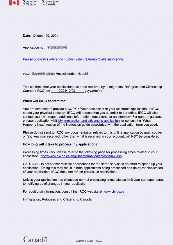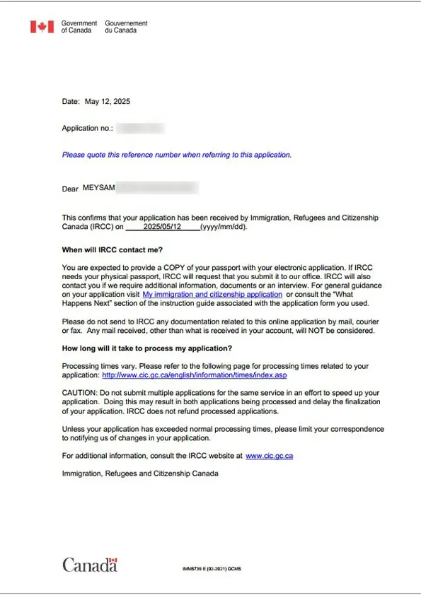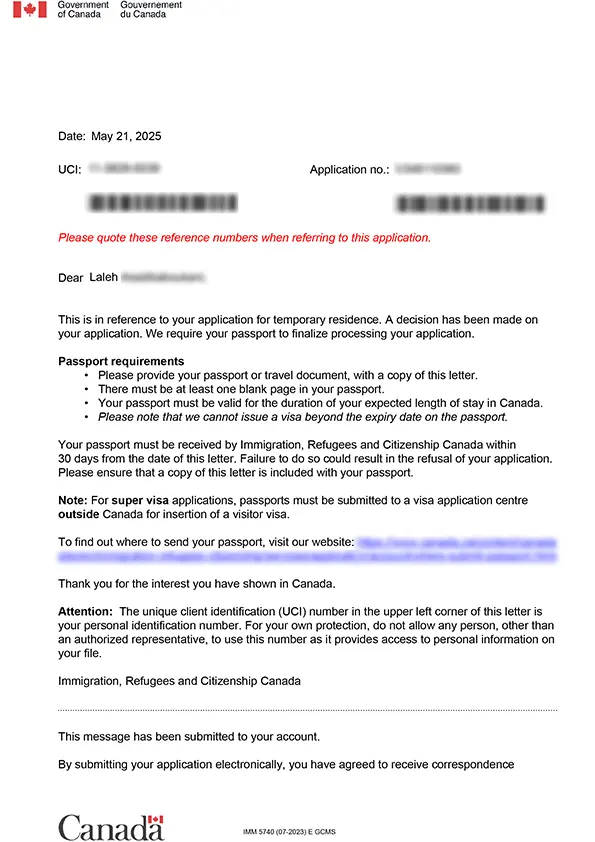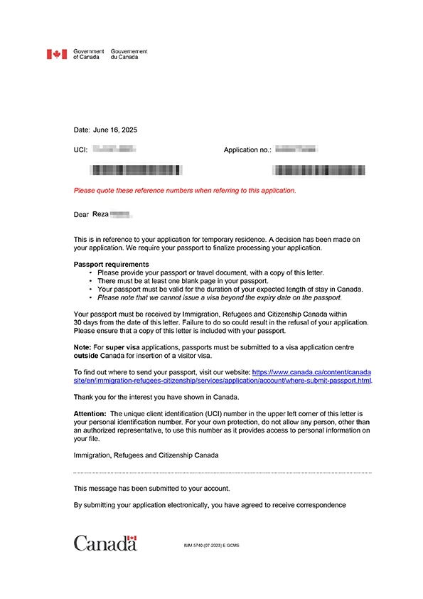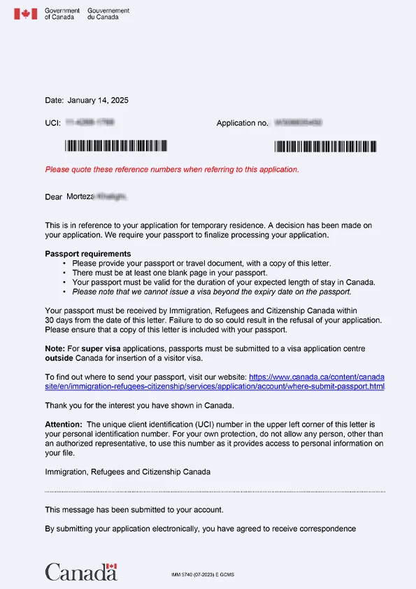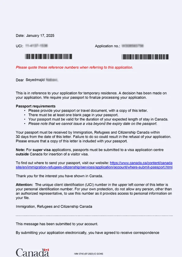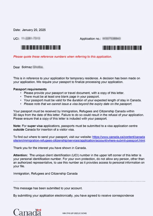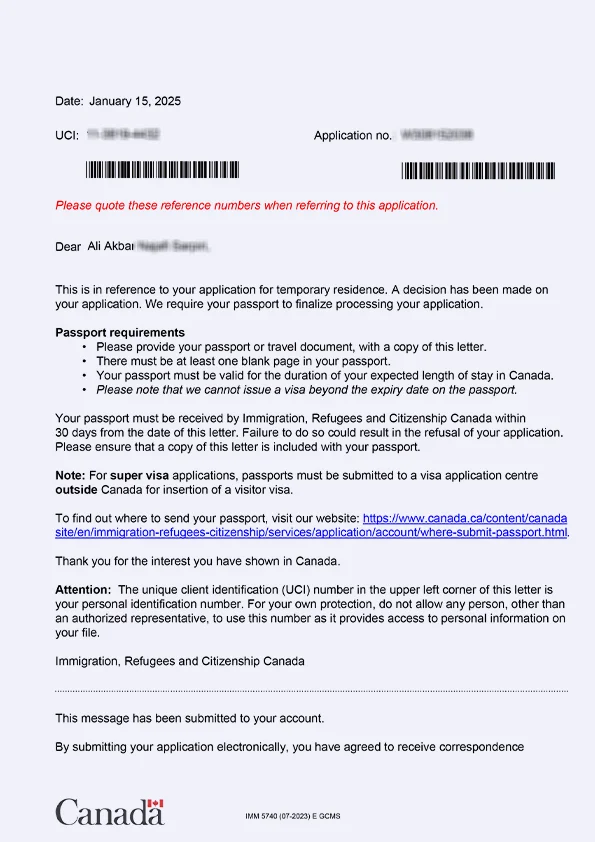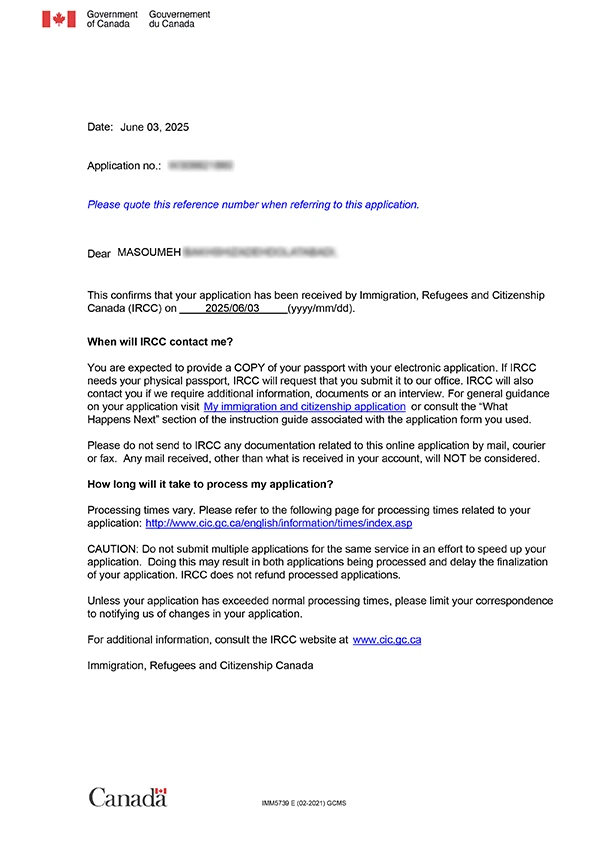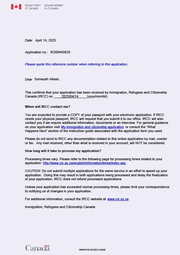 نامه سابمیت ویزای توریستی کانادا