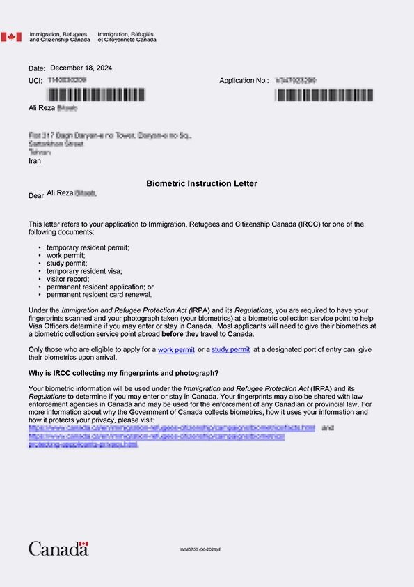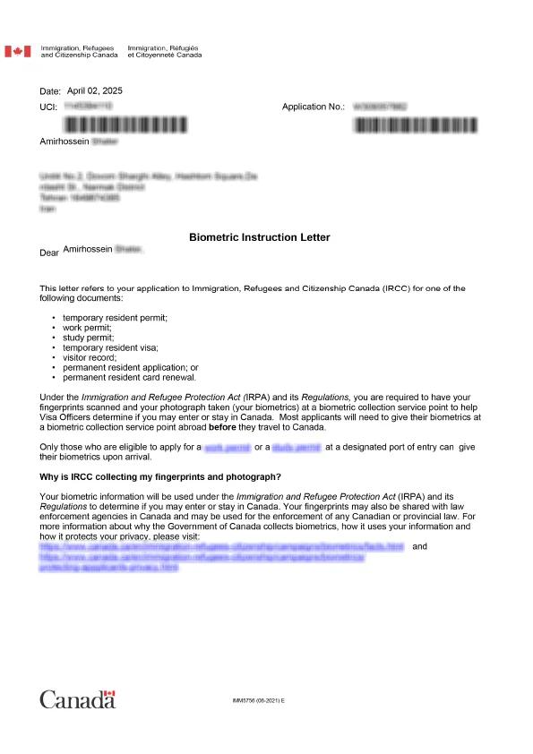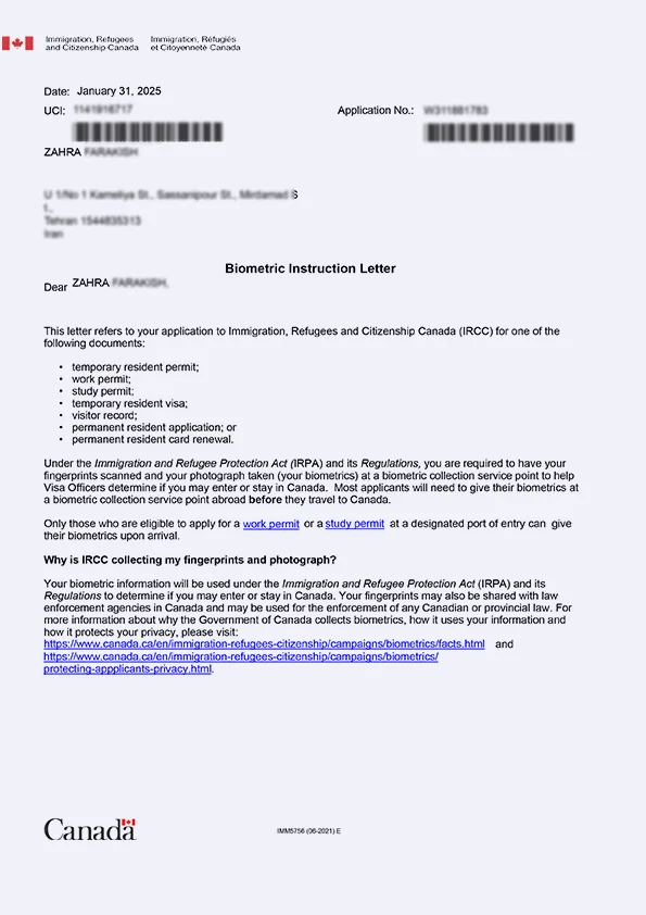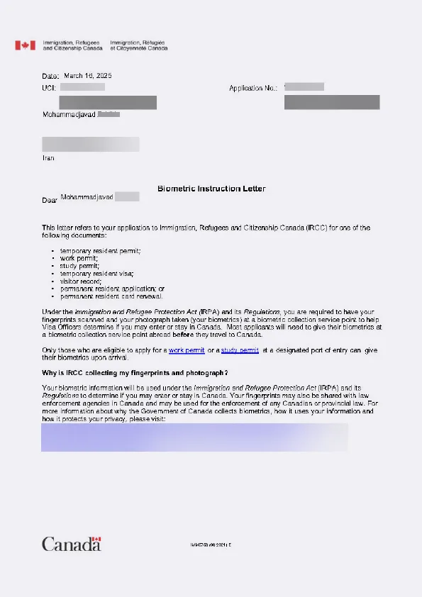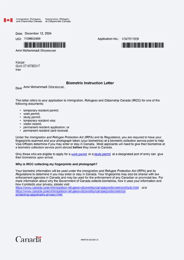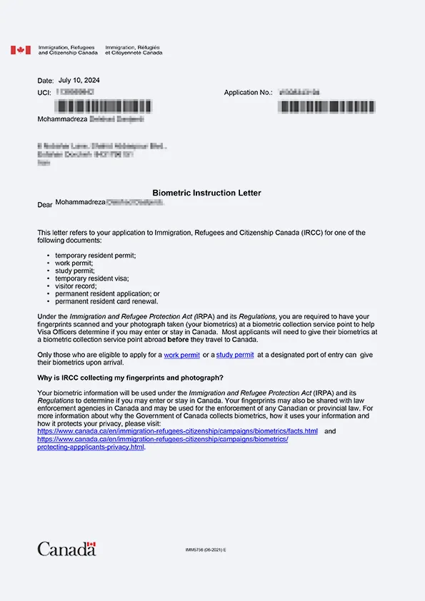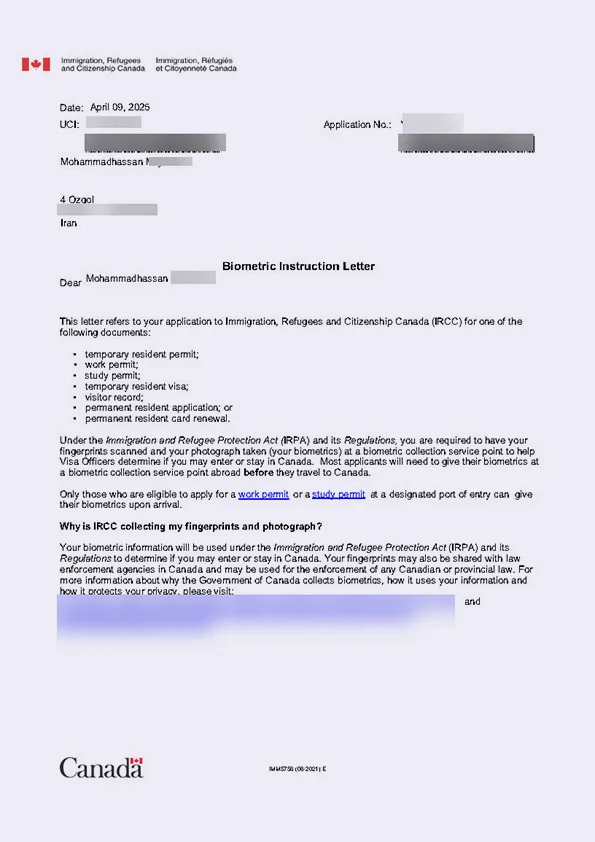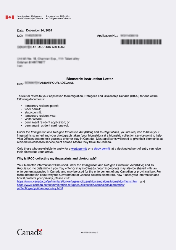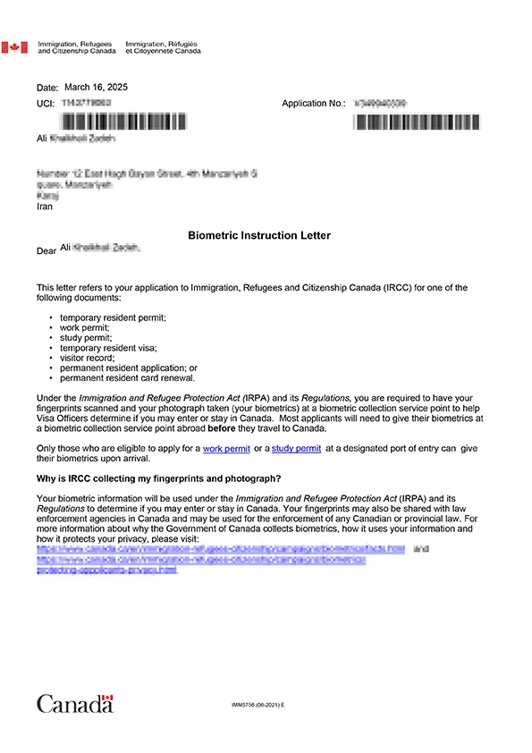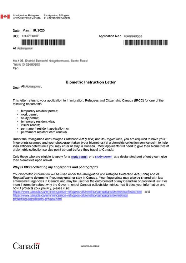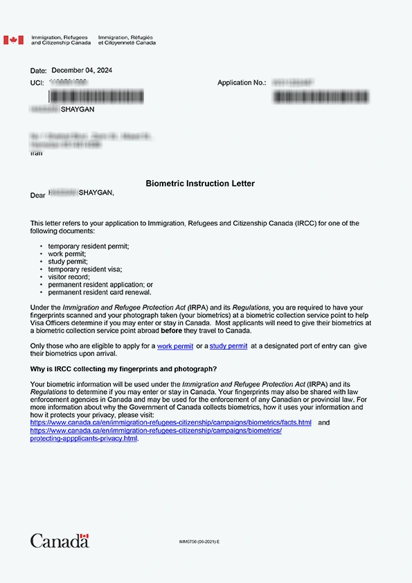 نامه انگشتنگاری کلاینت توریستی کانادا