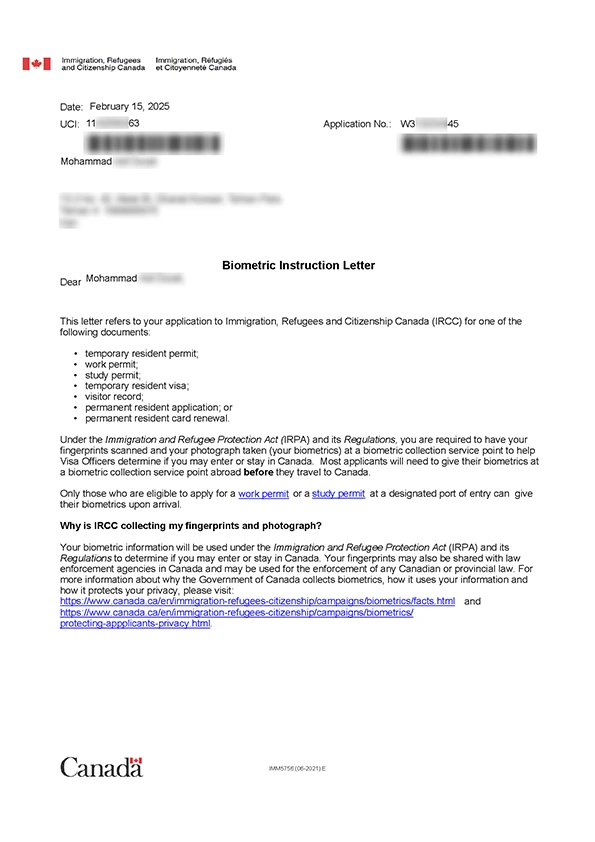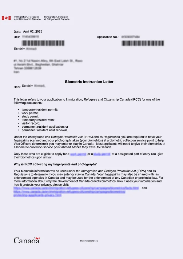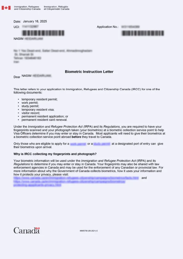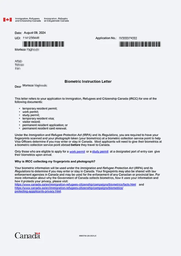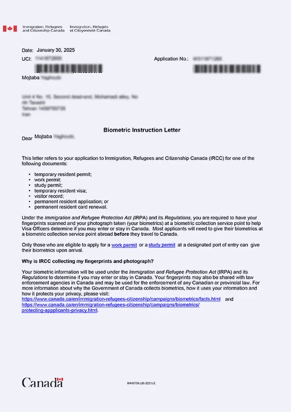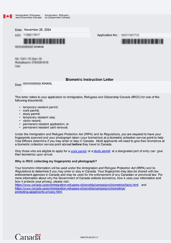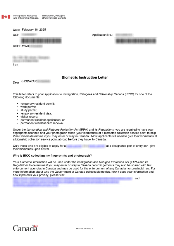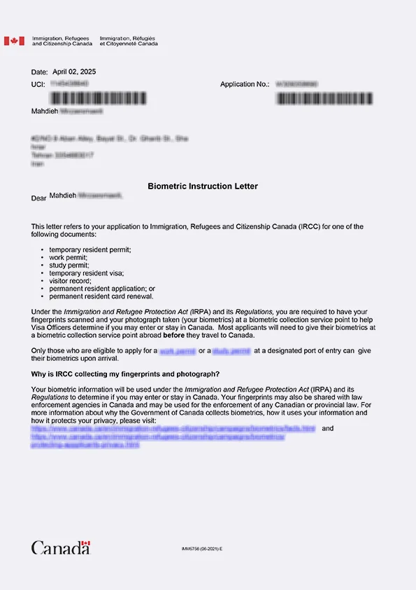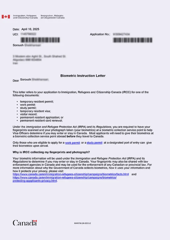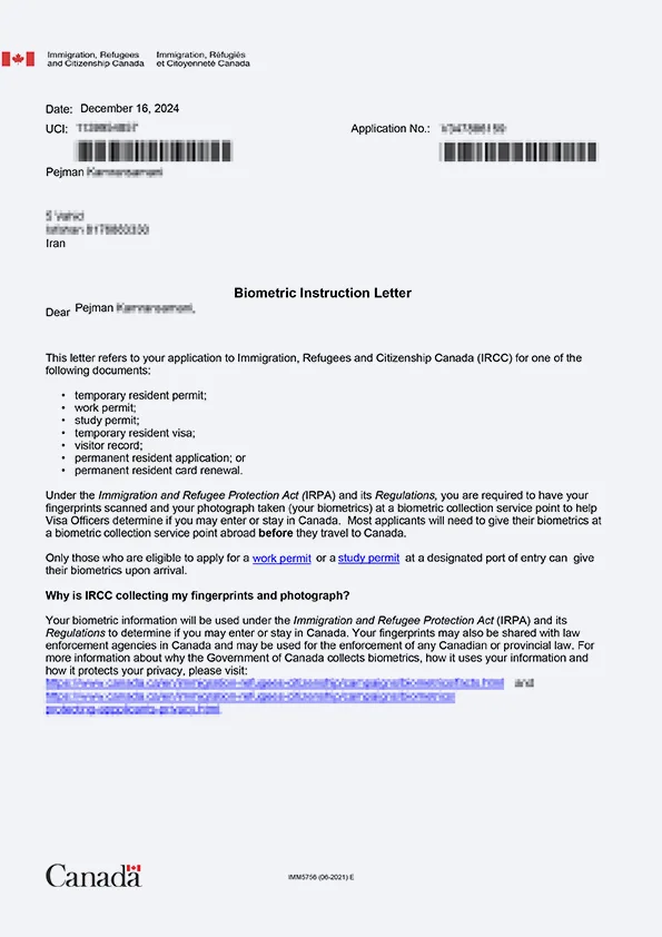 نامه انگشتنگاری کلاینت توریستی کانادا