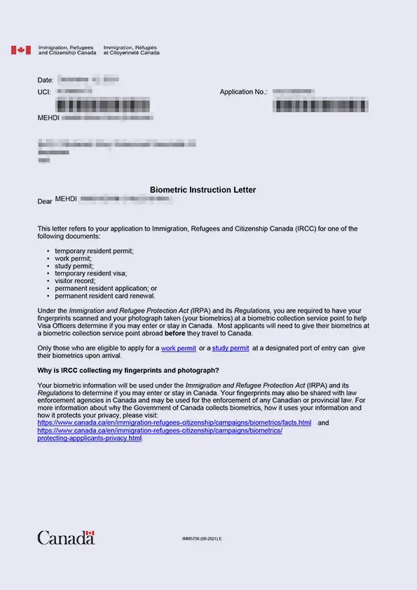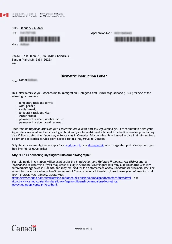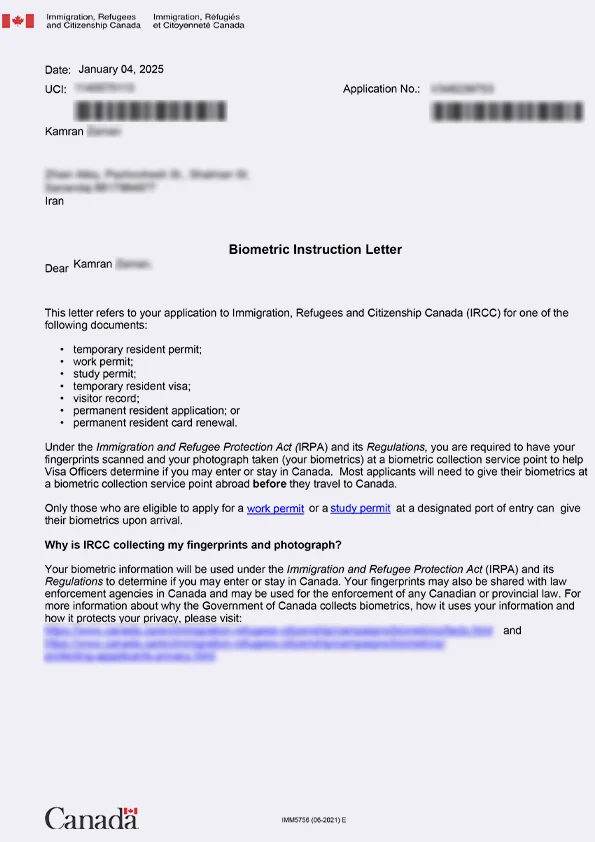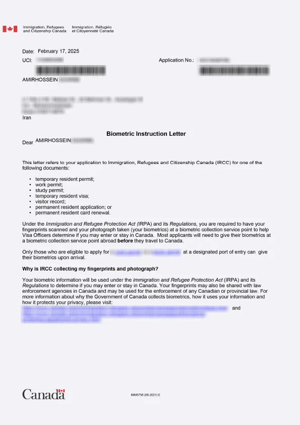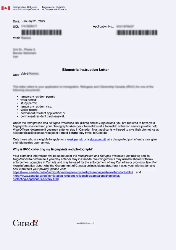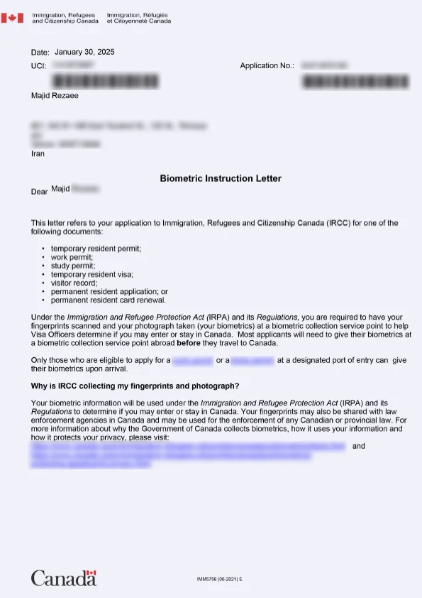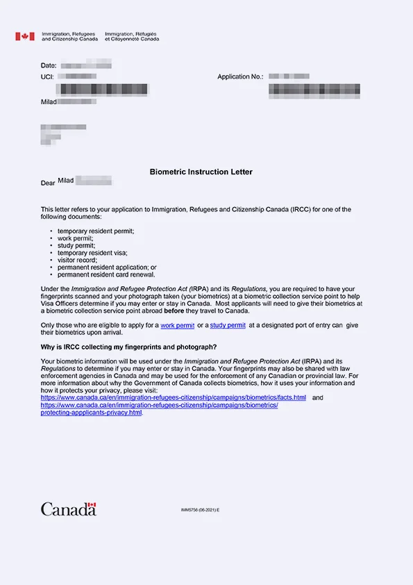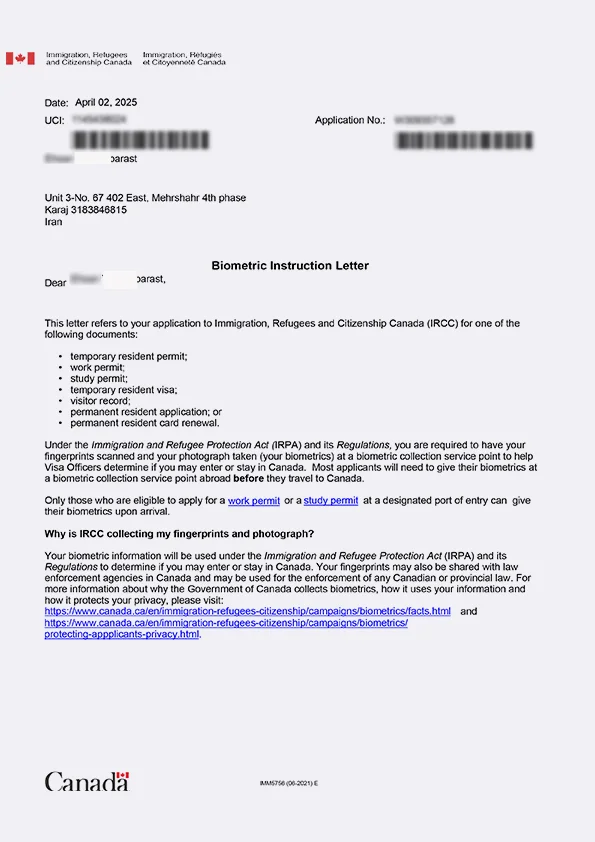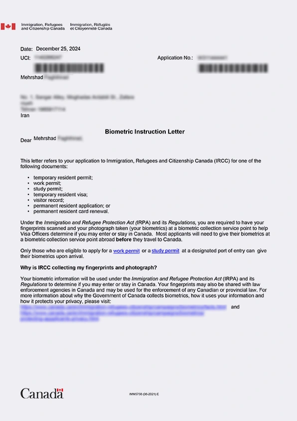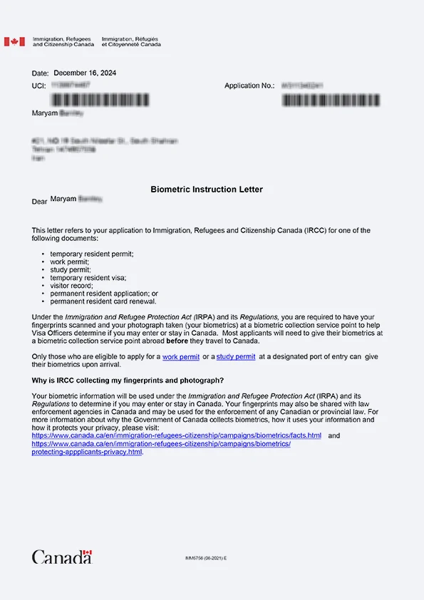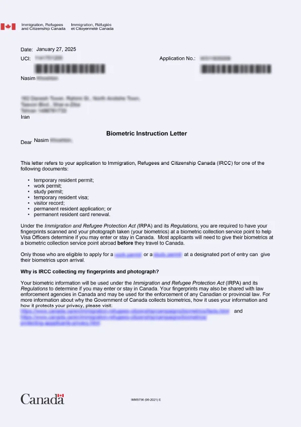 نامه انگشتنگاری کلاینت توریستی کانادا