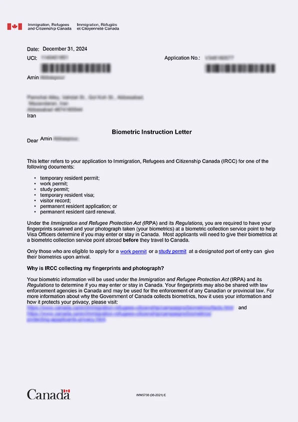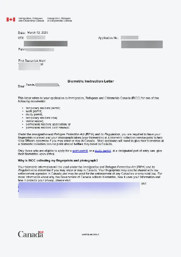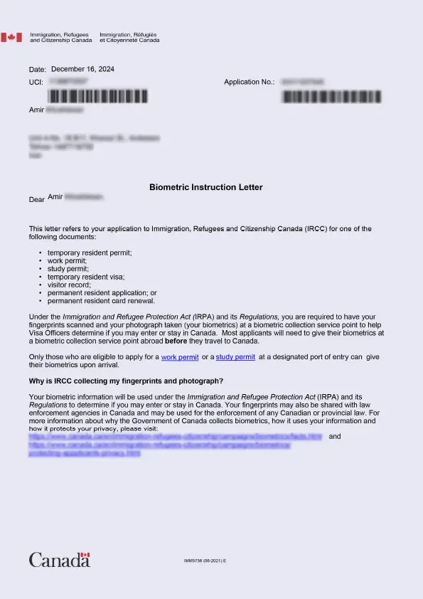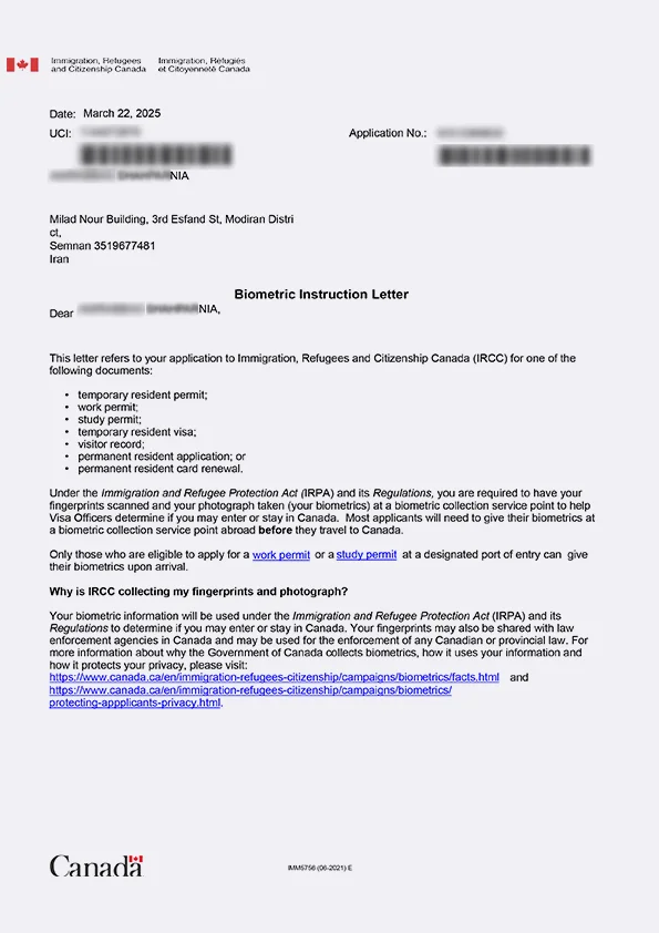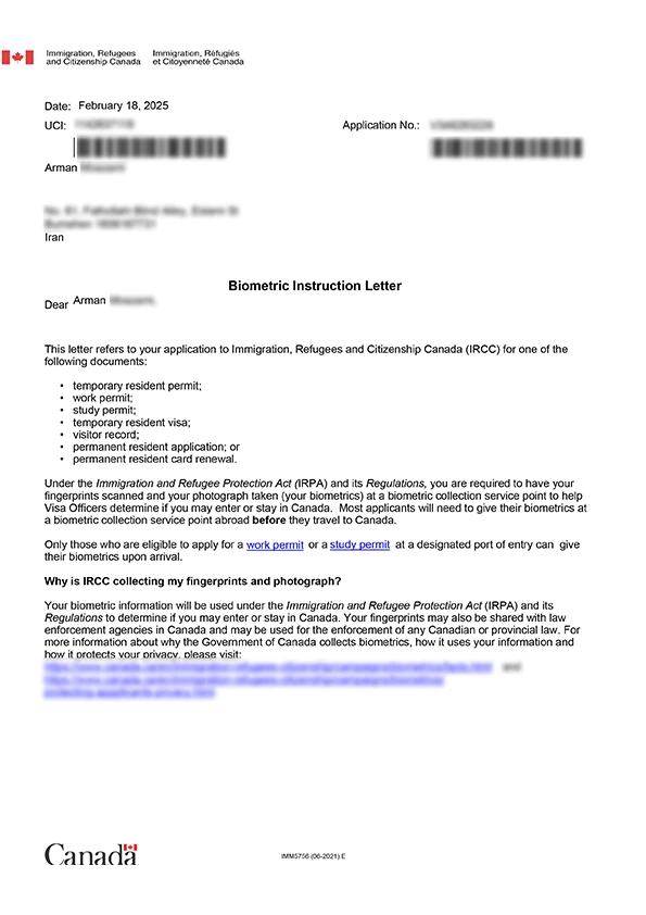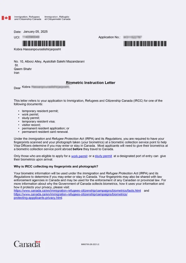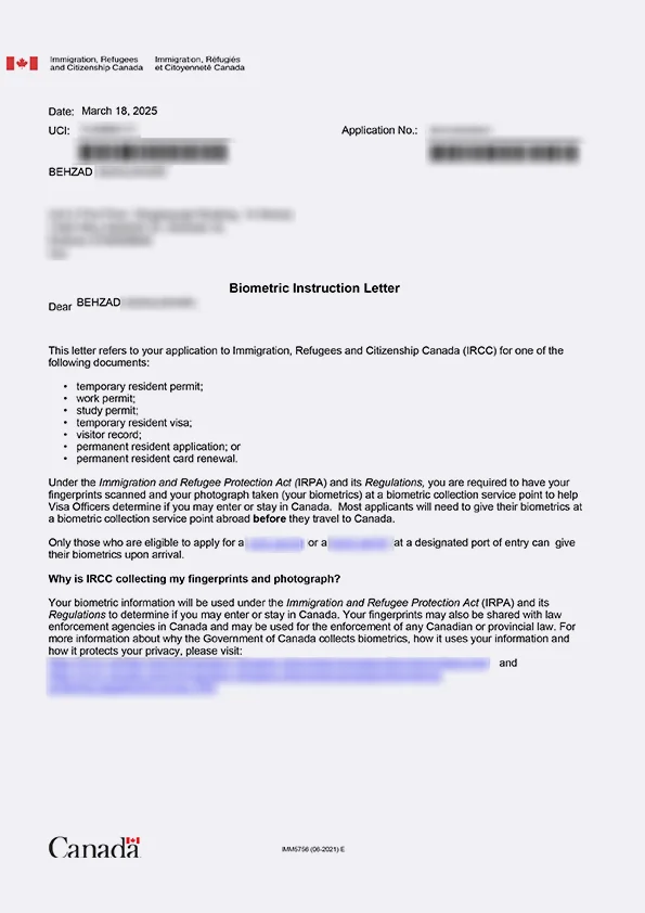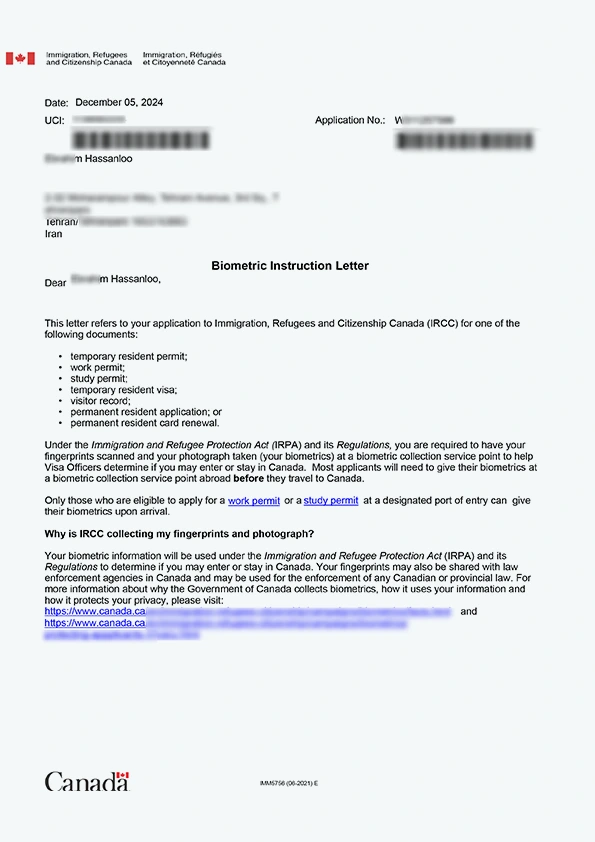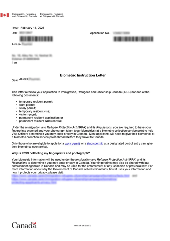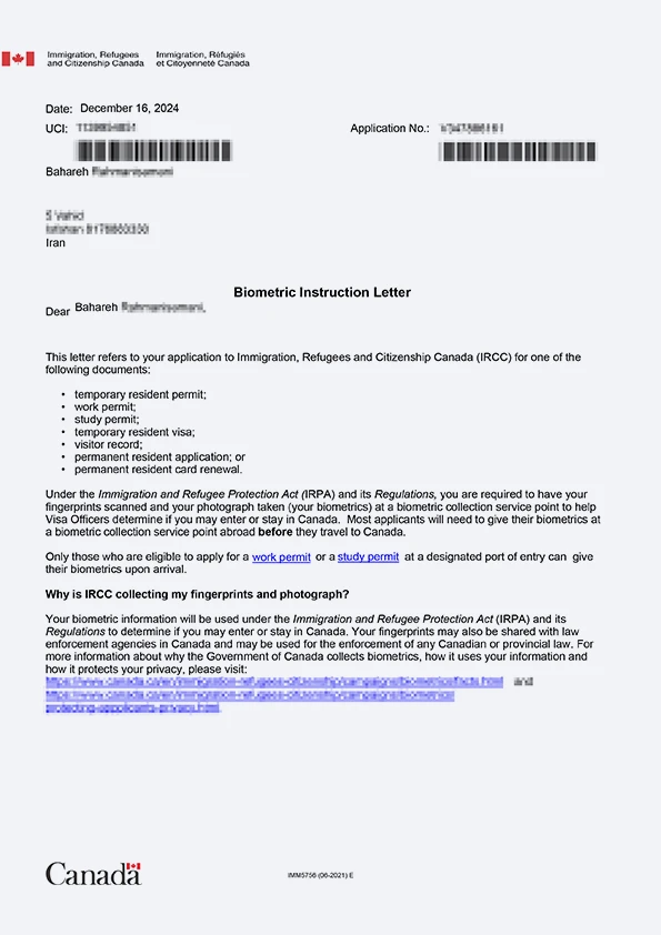 نامه انگشتنگاری کلاینت توریستی کانادا