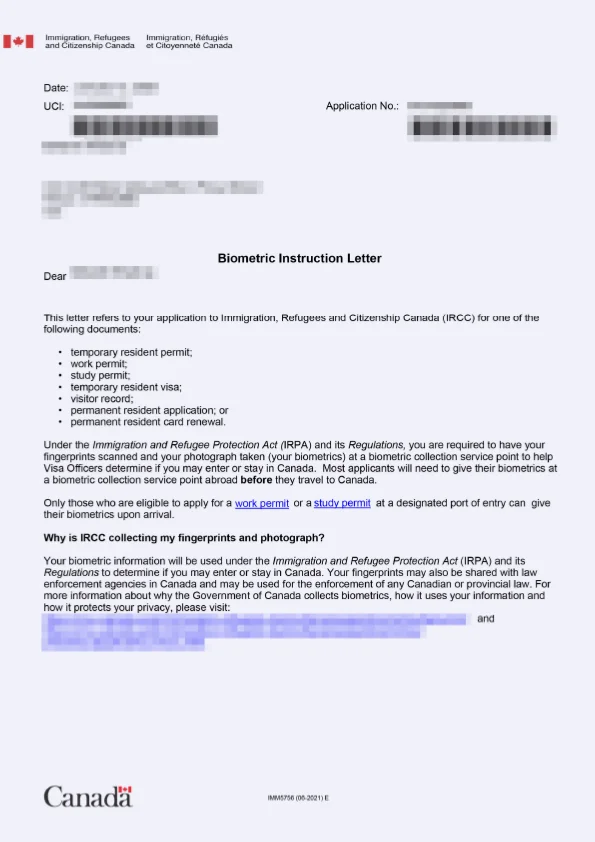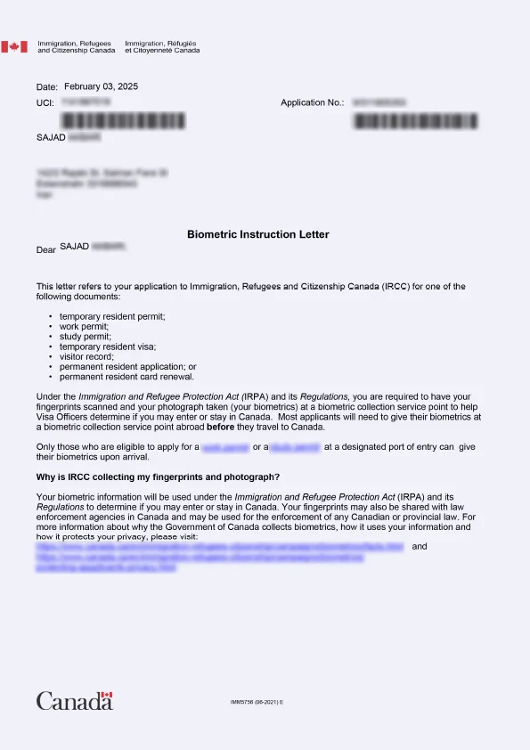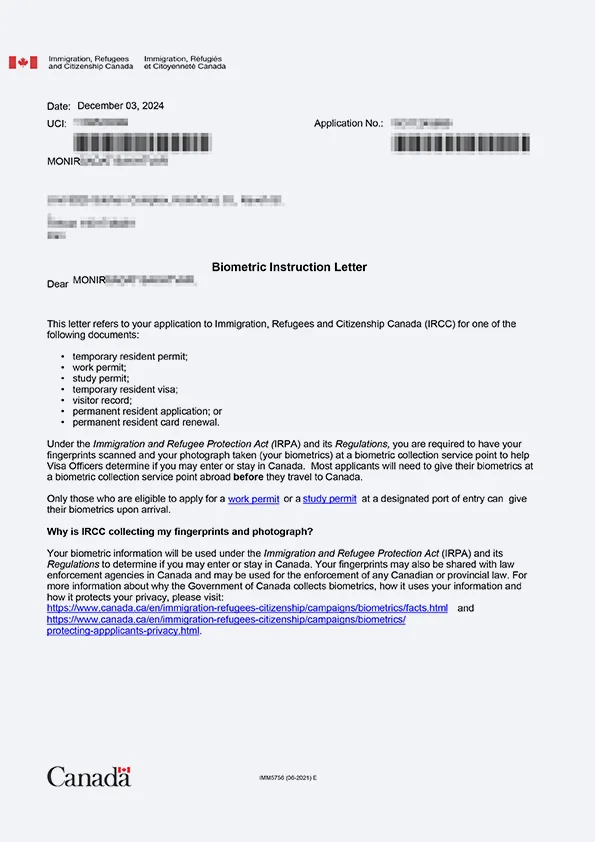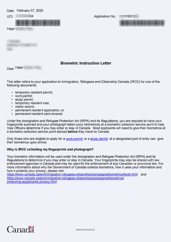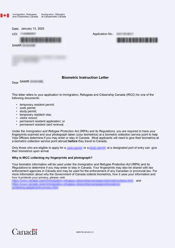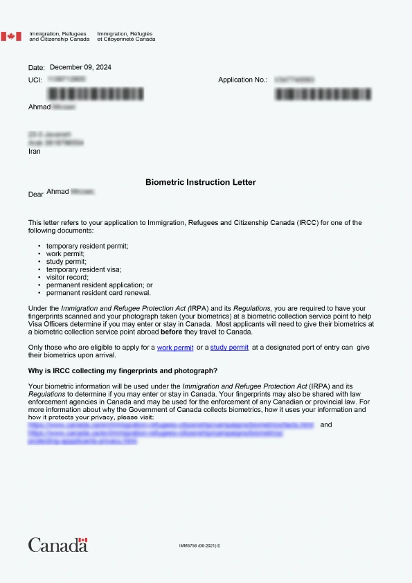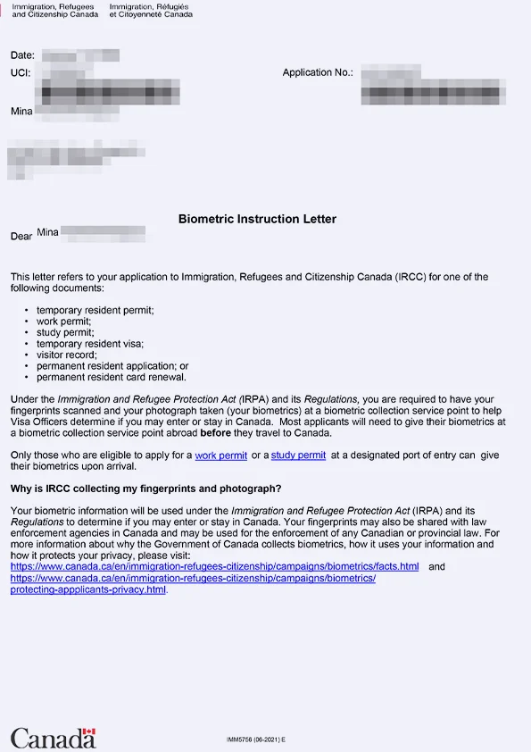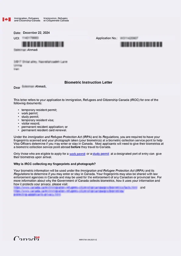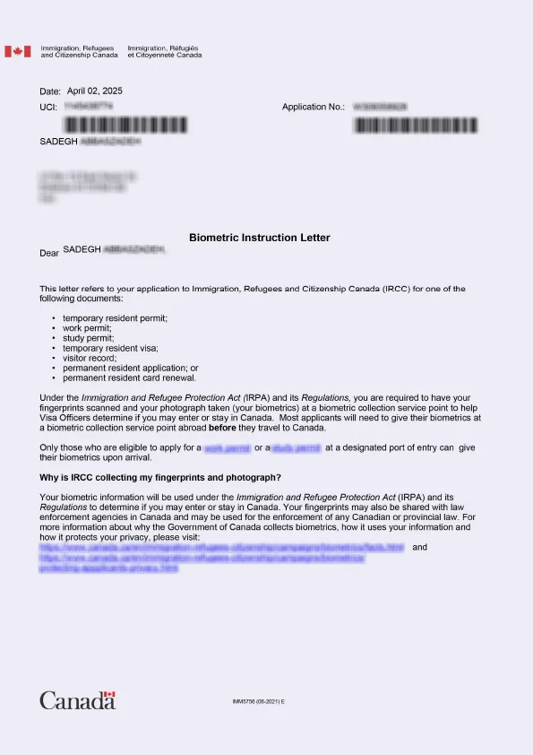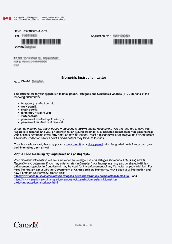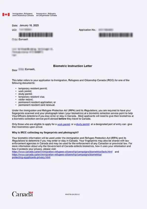 نامه انگشتنگاری کلاینت توریستی کانادا