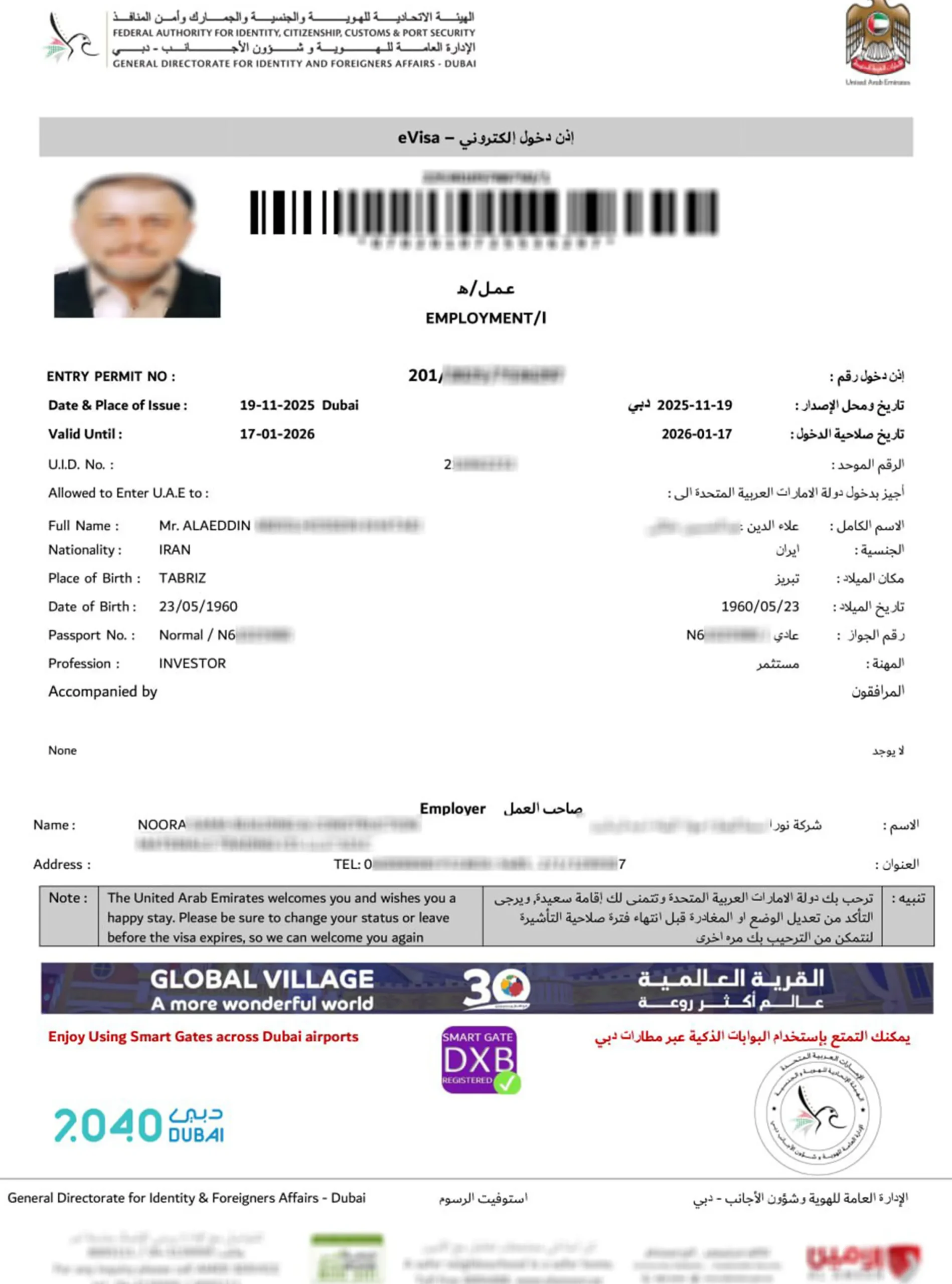 نمونه ویزای الکترونیکی امارات