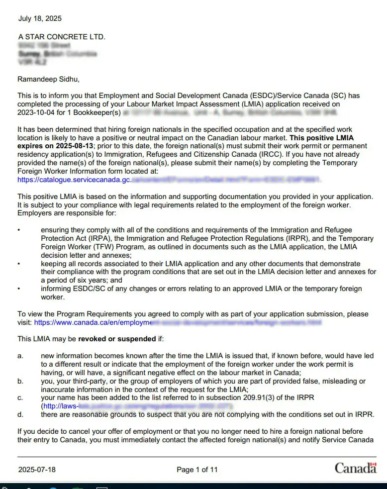 نامه LMIA مثبت کانادا