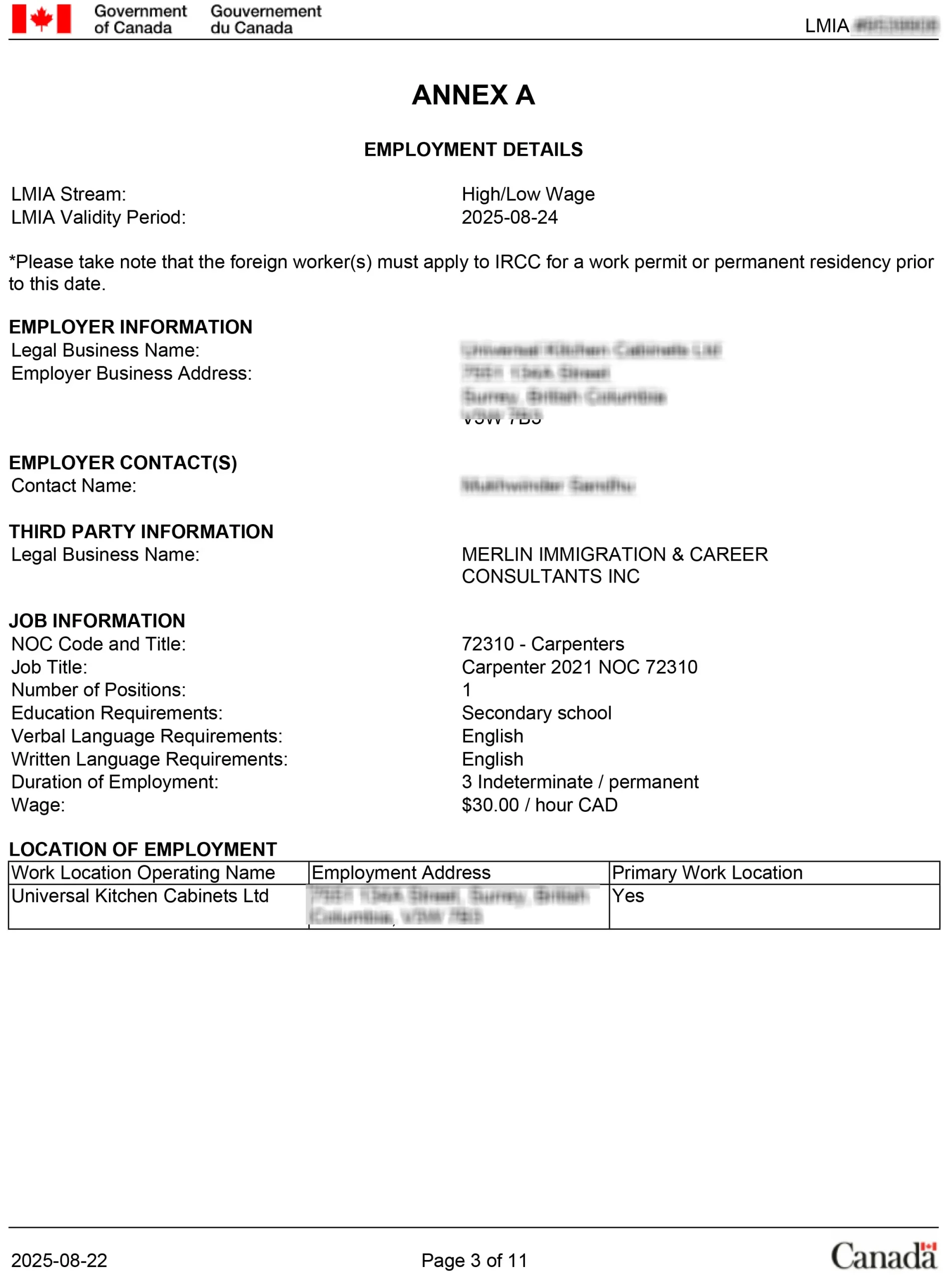 نامه LMIA مثبت شغل نجاری