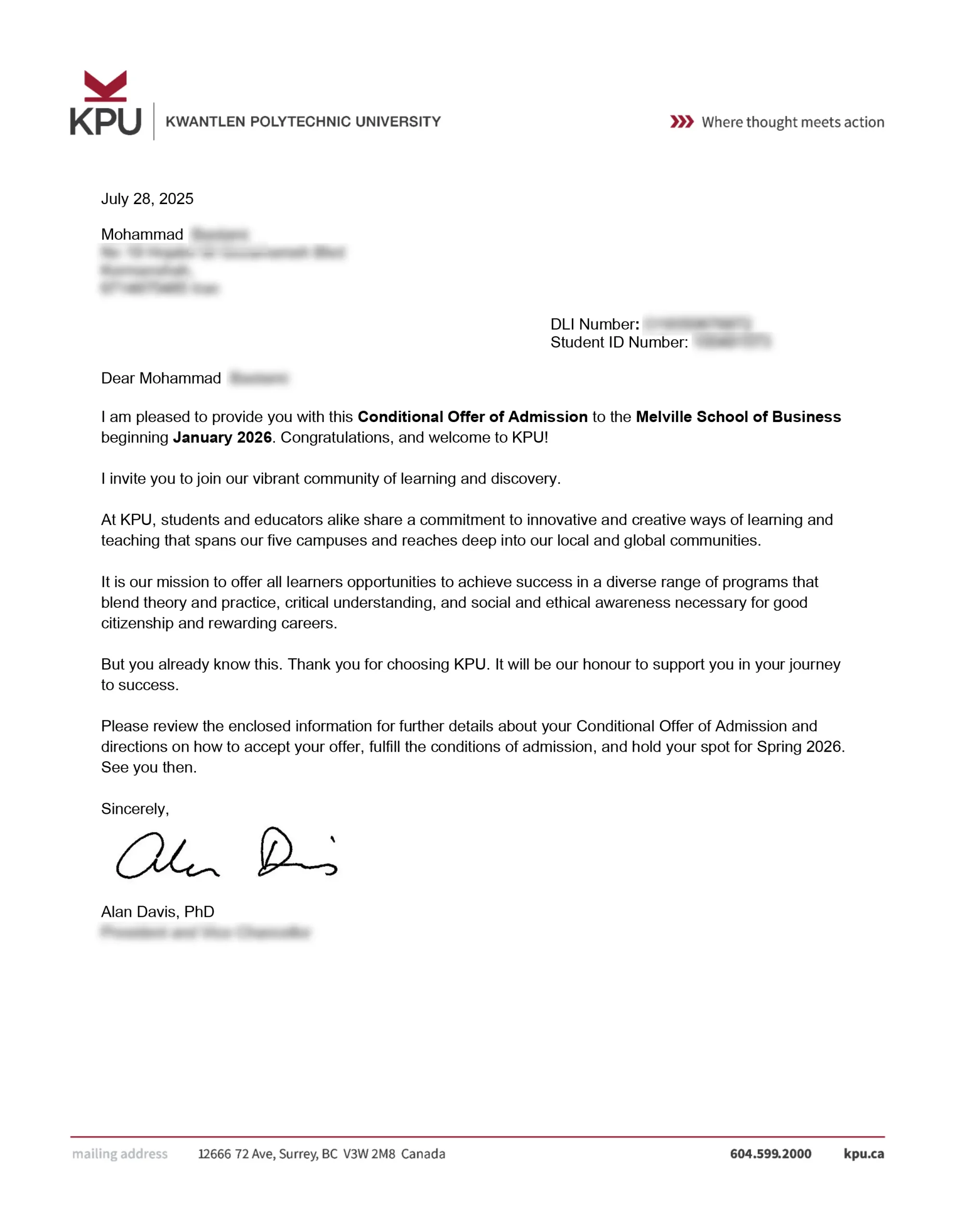 نامه پذیرش از دانشگاه براک کانادا