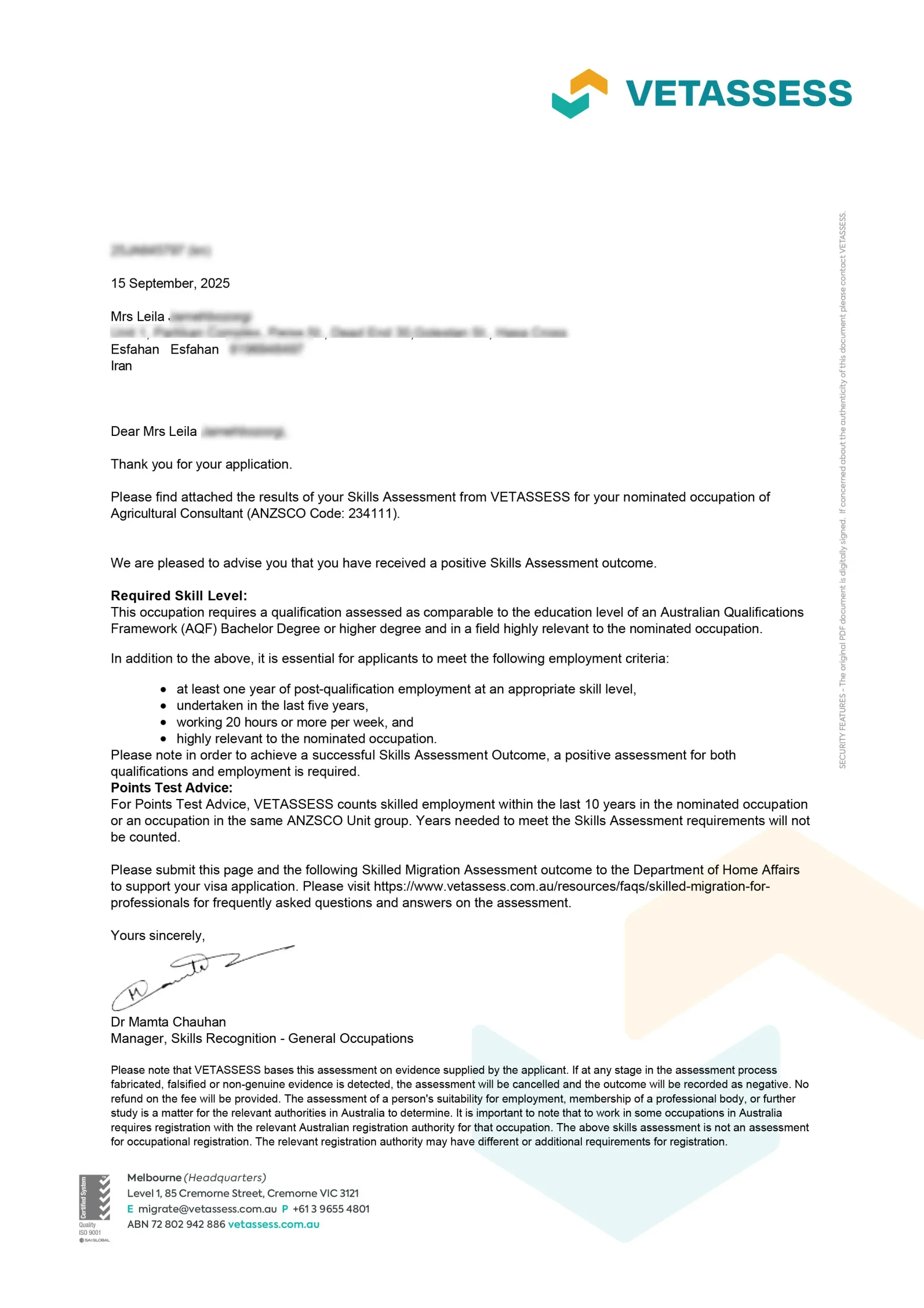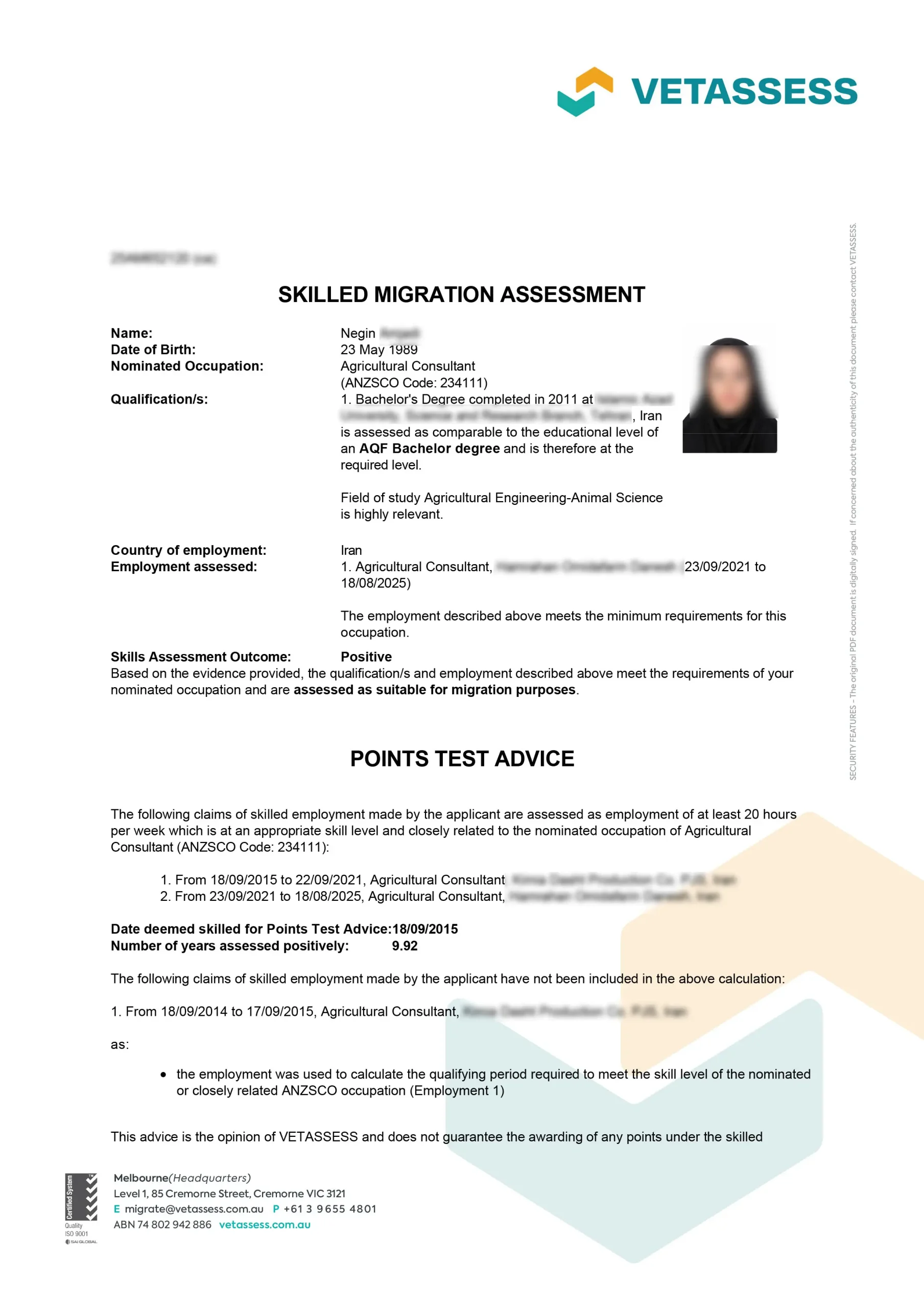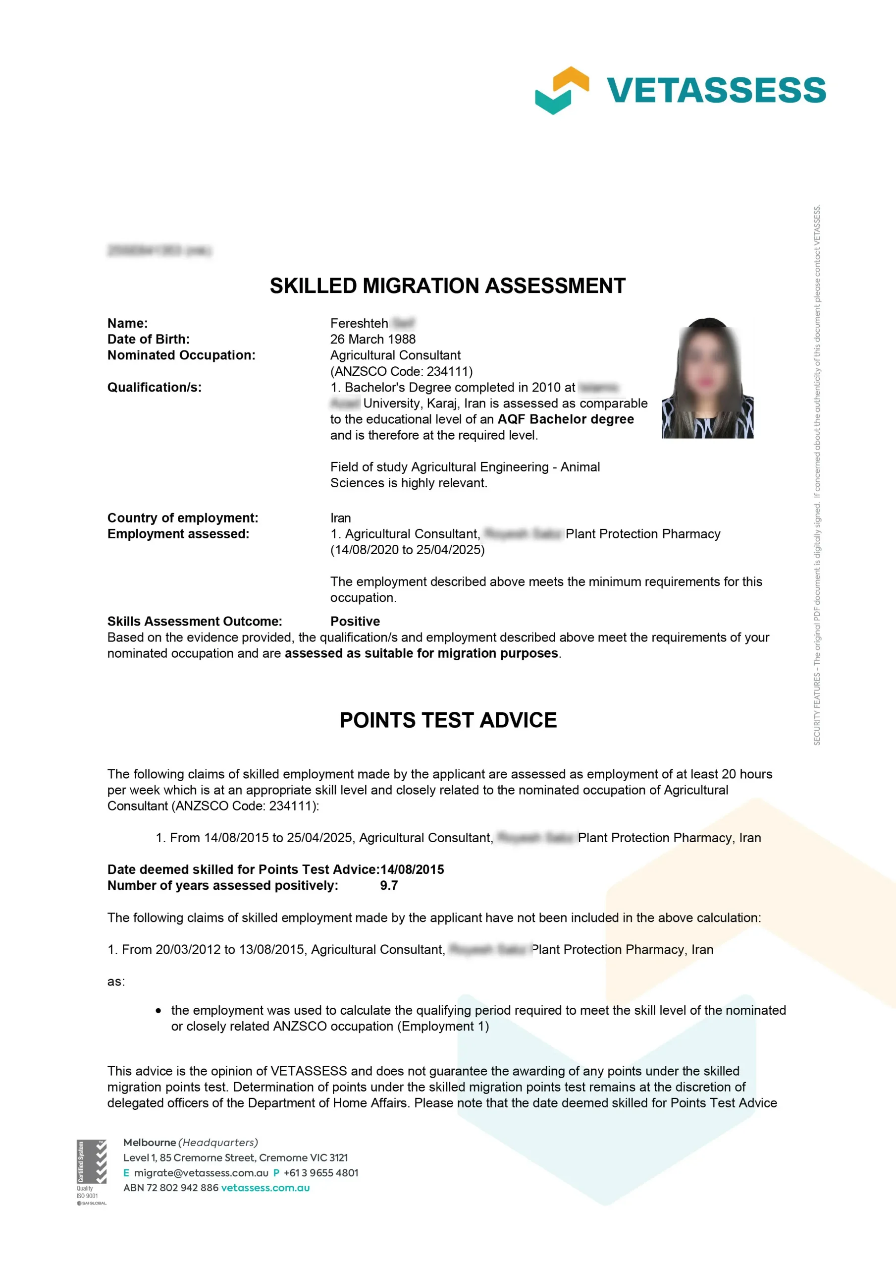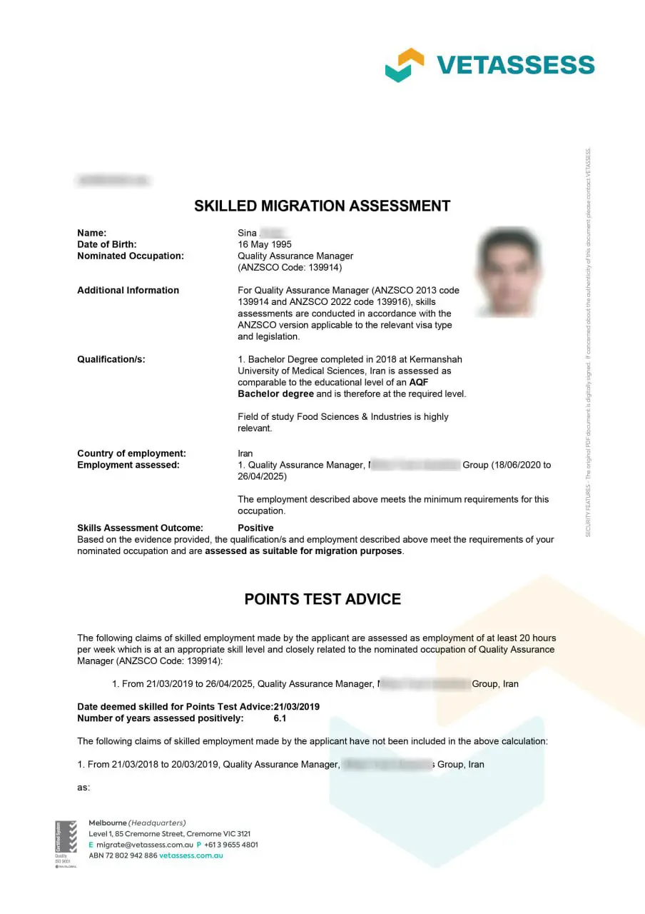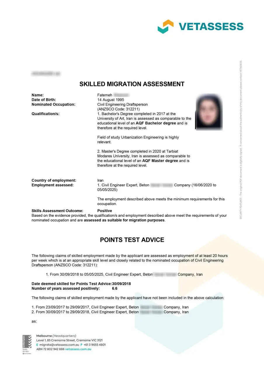 نامه ارزیابی مهارت از vetassess استرالیا