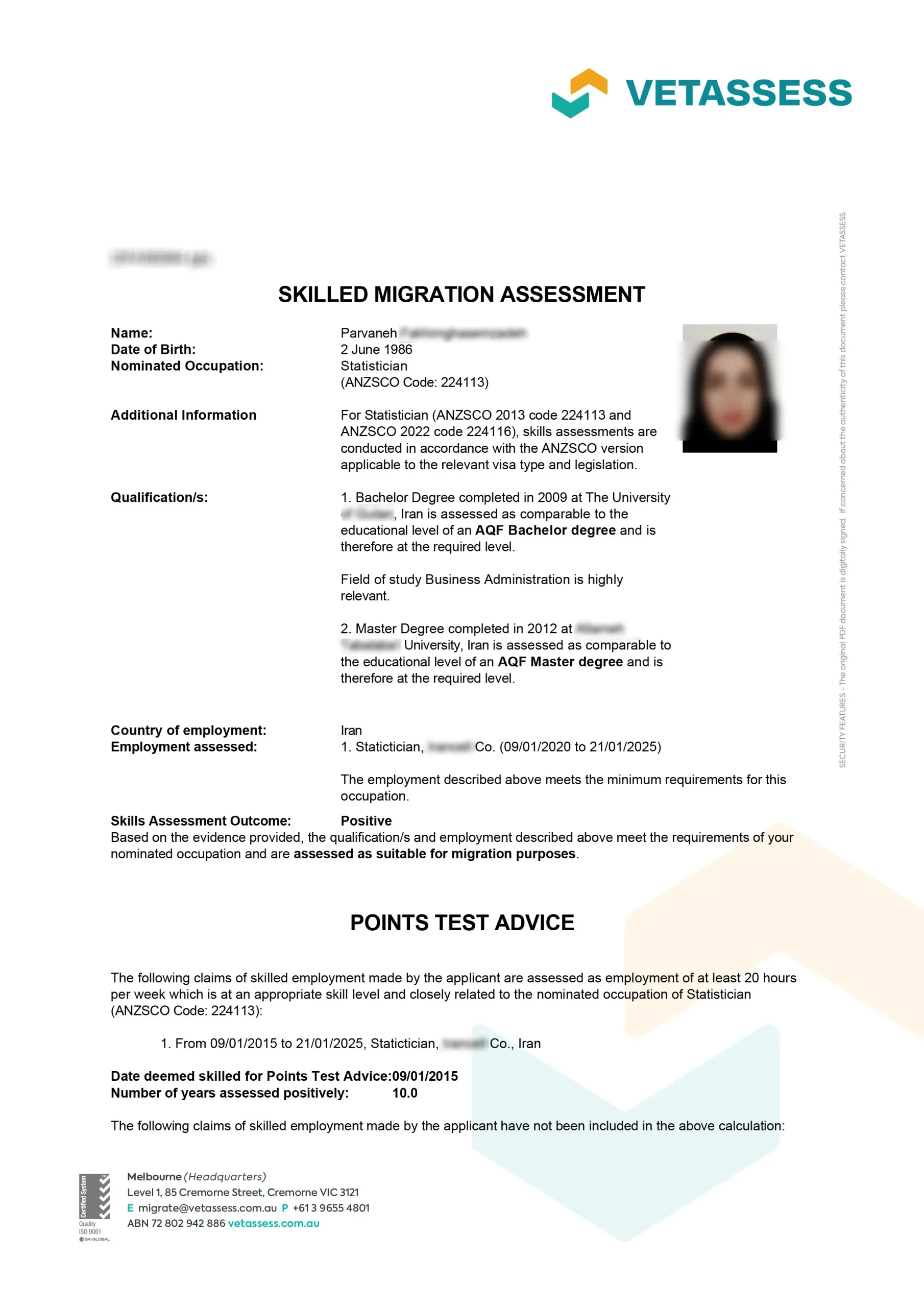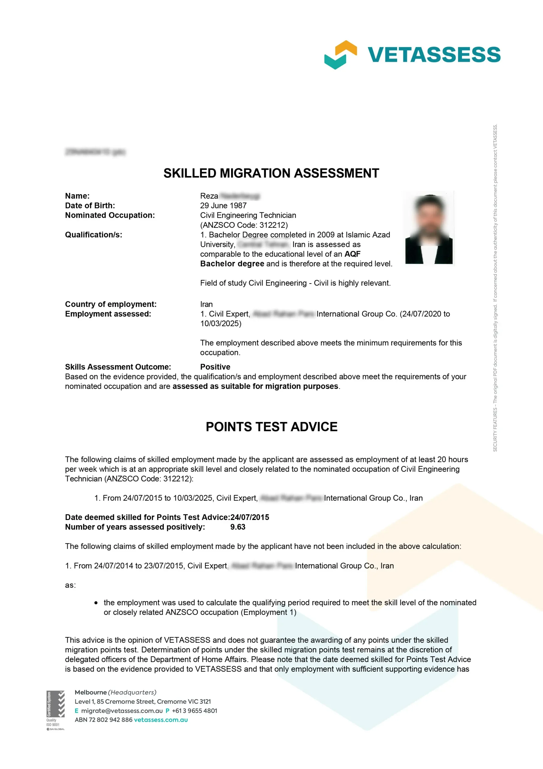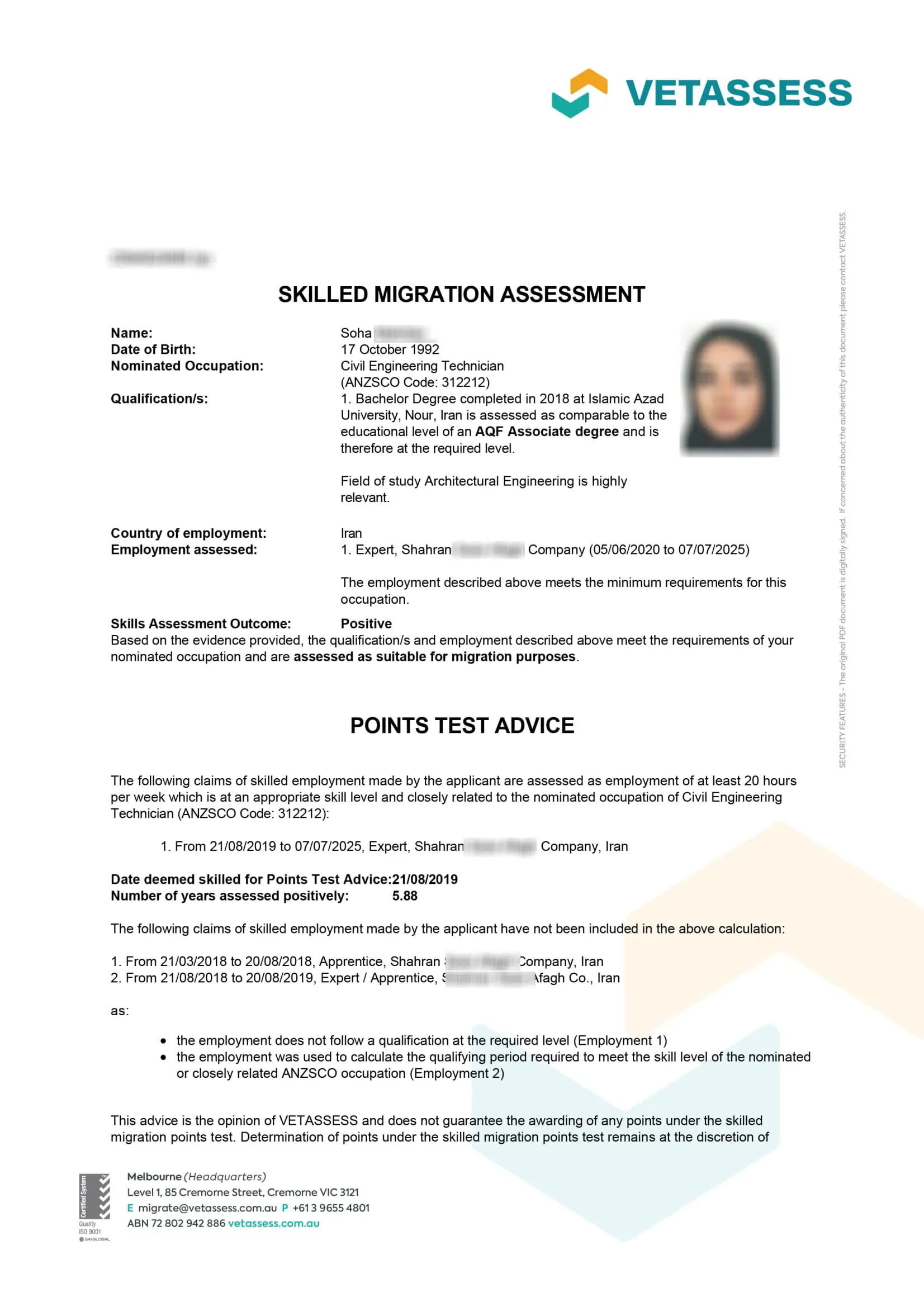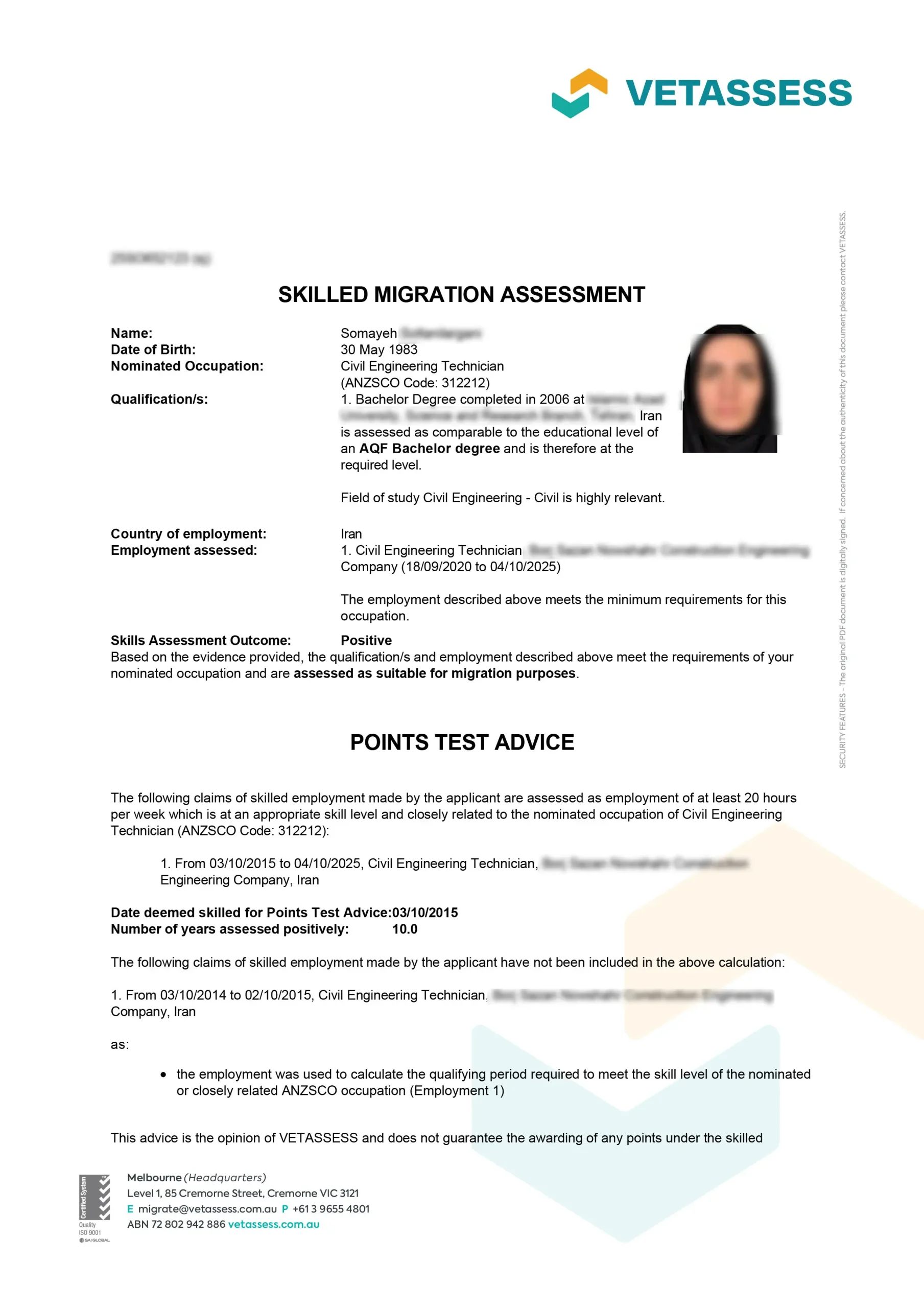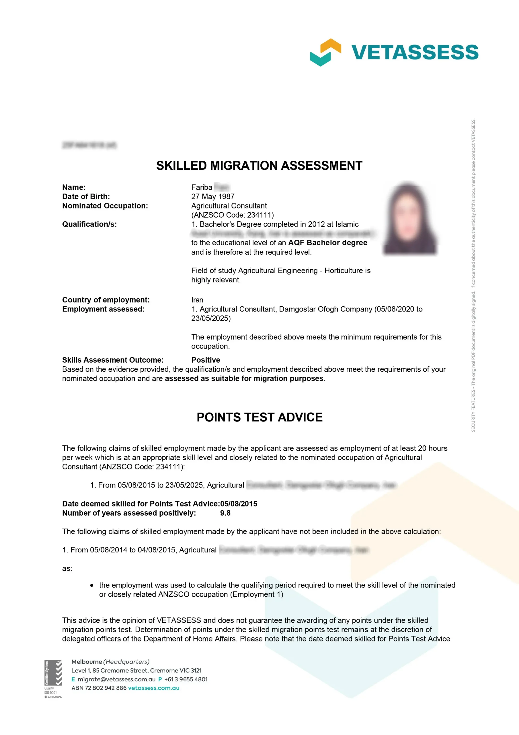 نامه ارزیابی مهارت از vetassess استرالیا