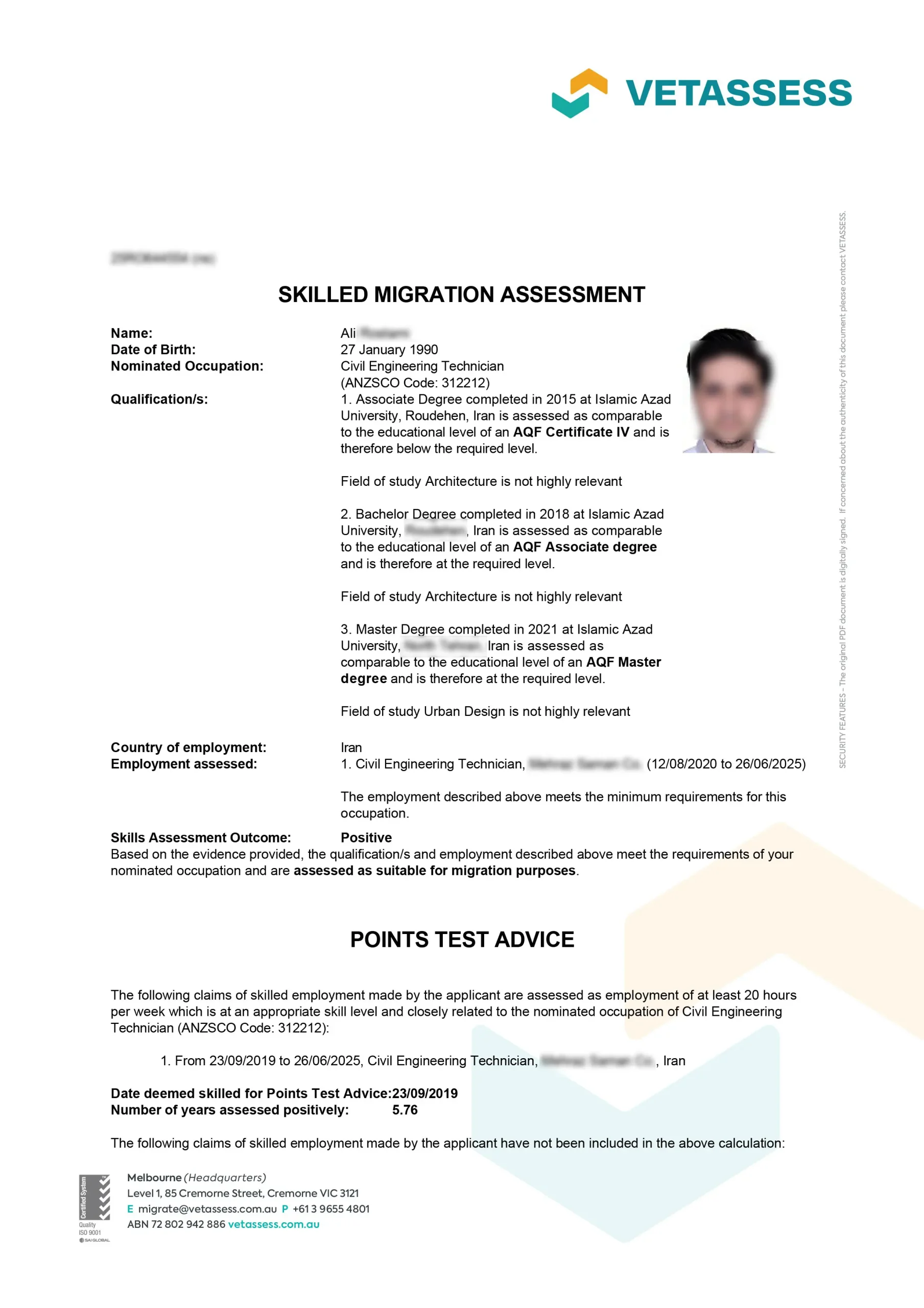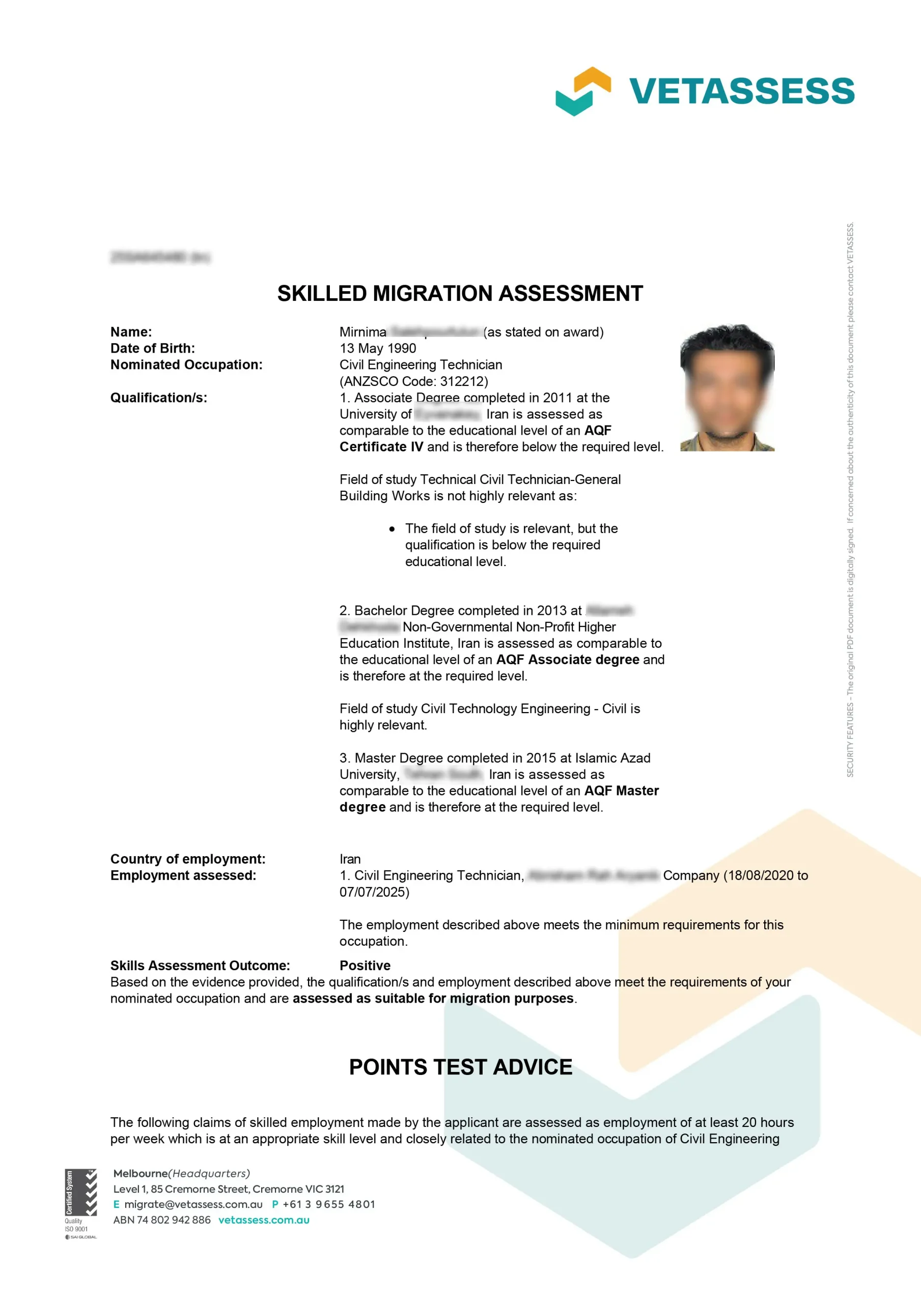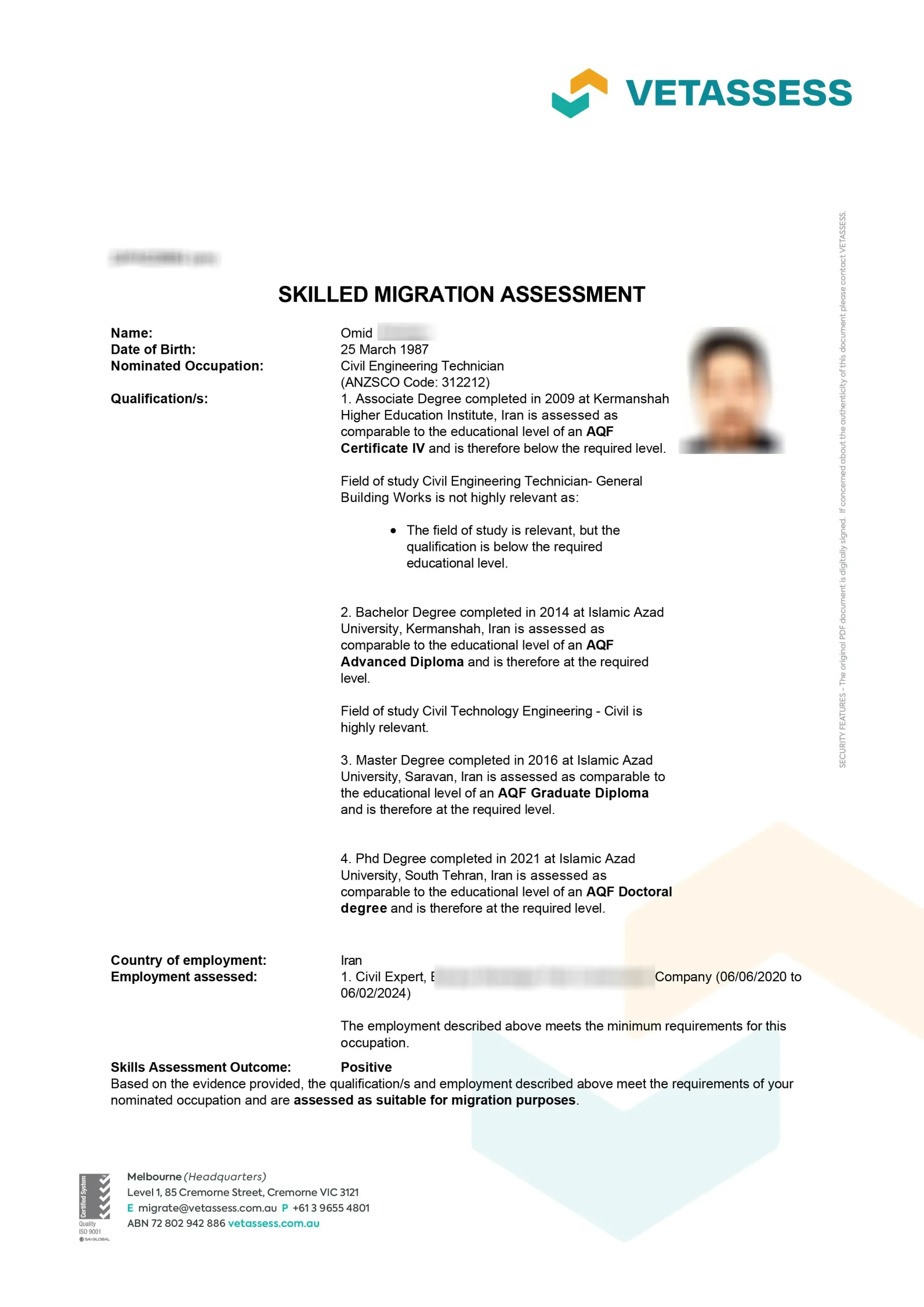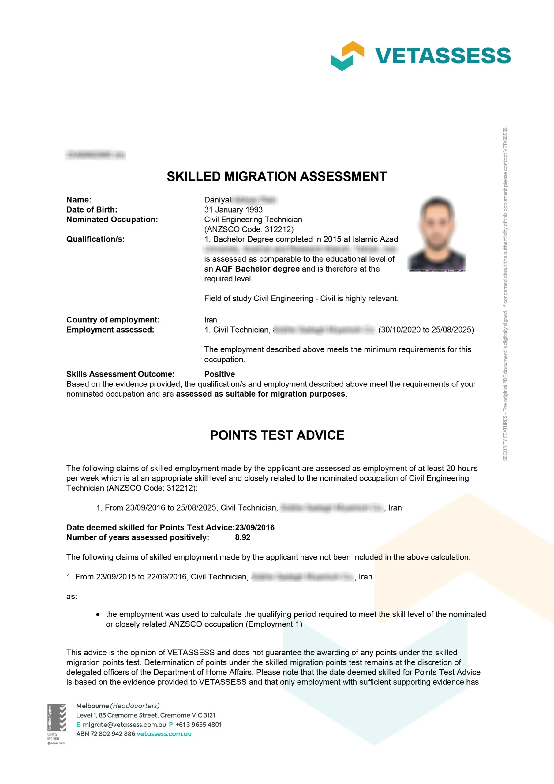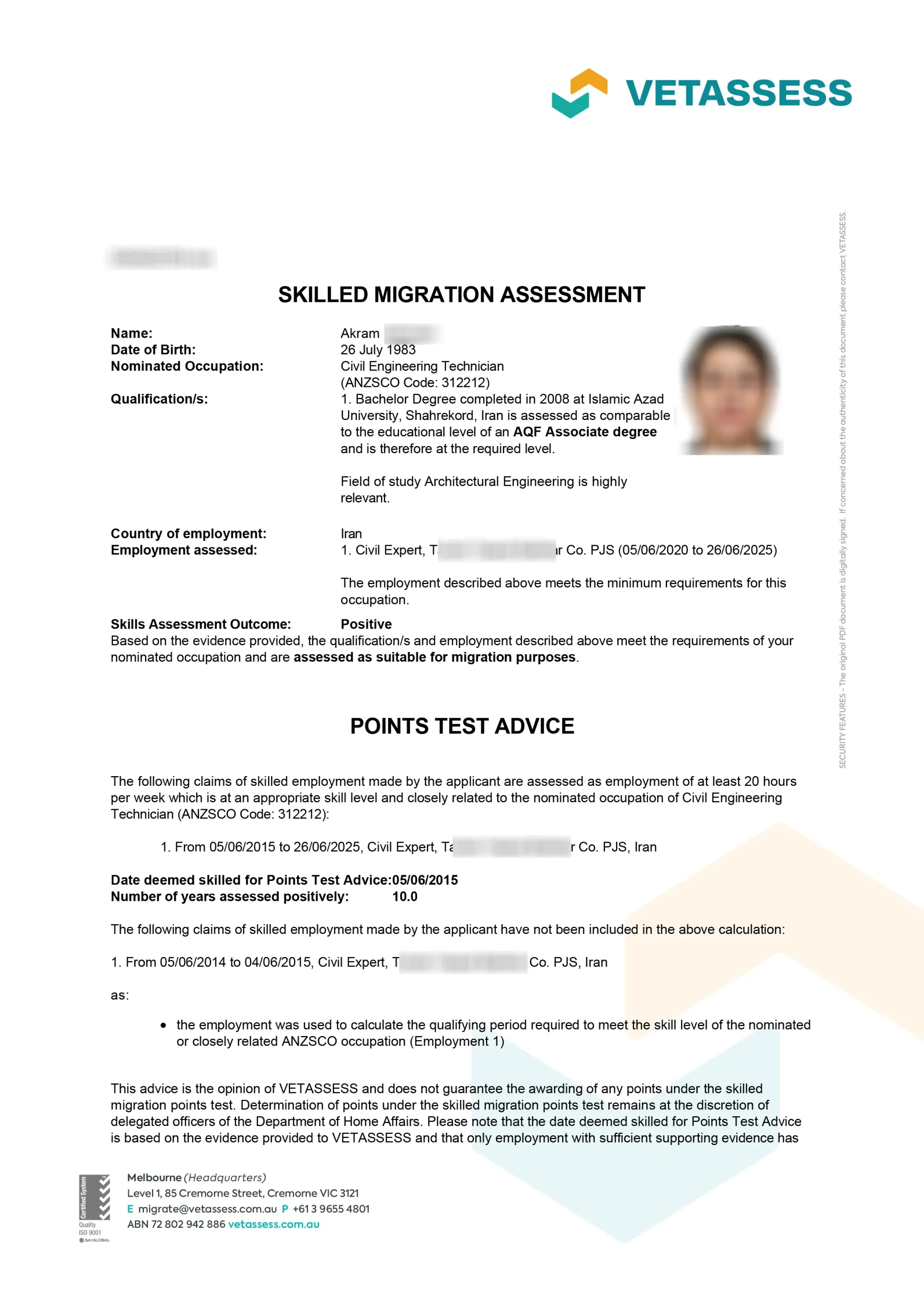 نامه ارزیابی مهارت از vetassess استرالیا