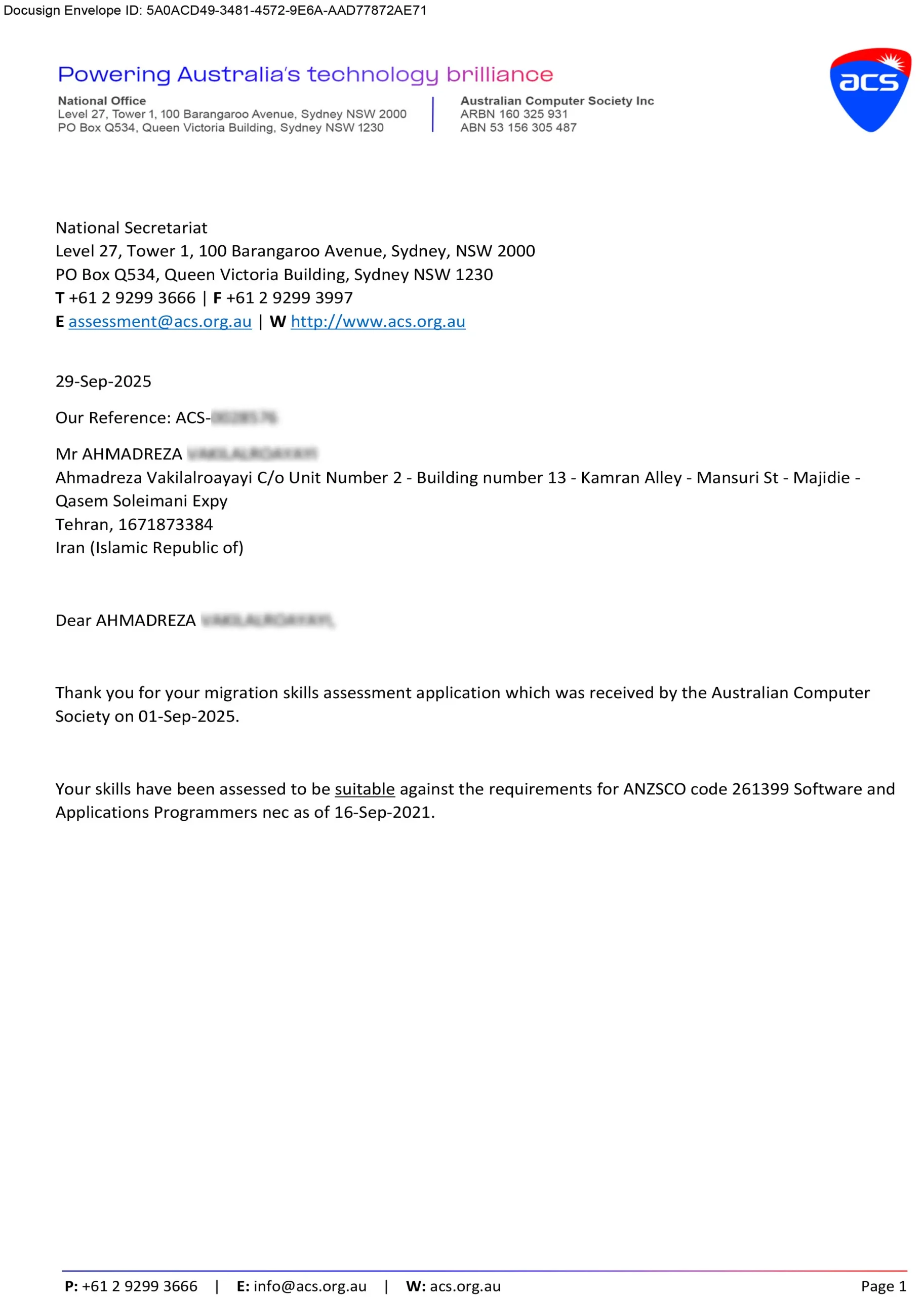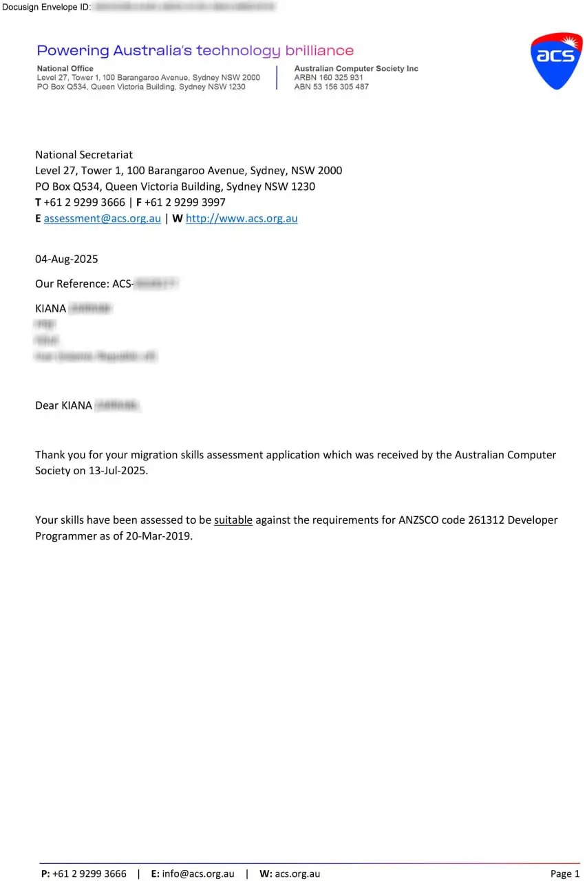 نامه ارزیابی مثبت مهارت استرالیا