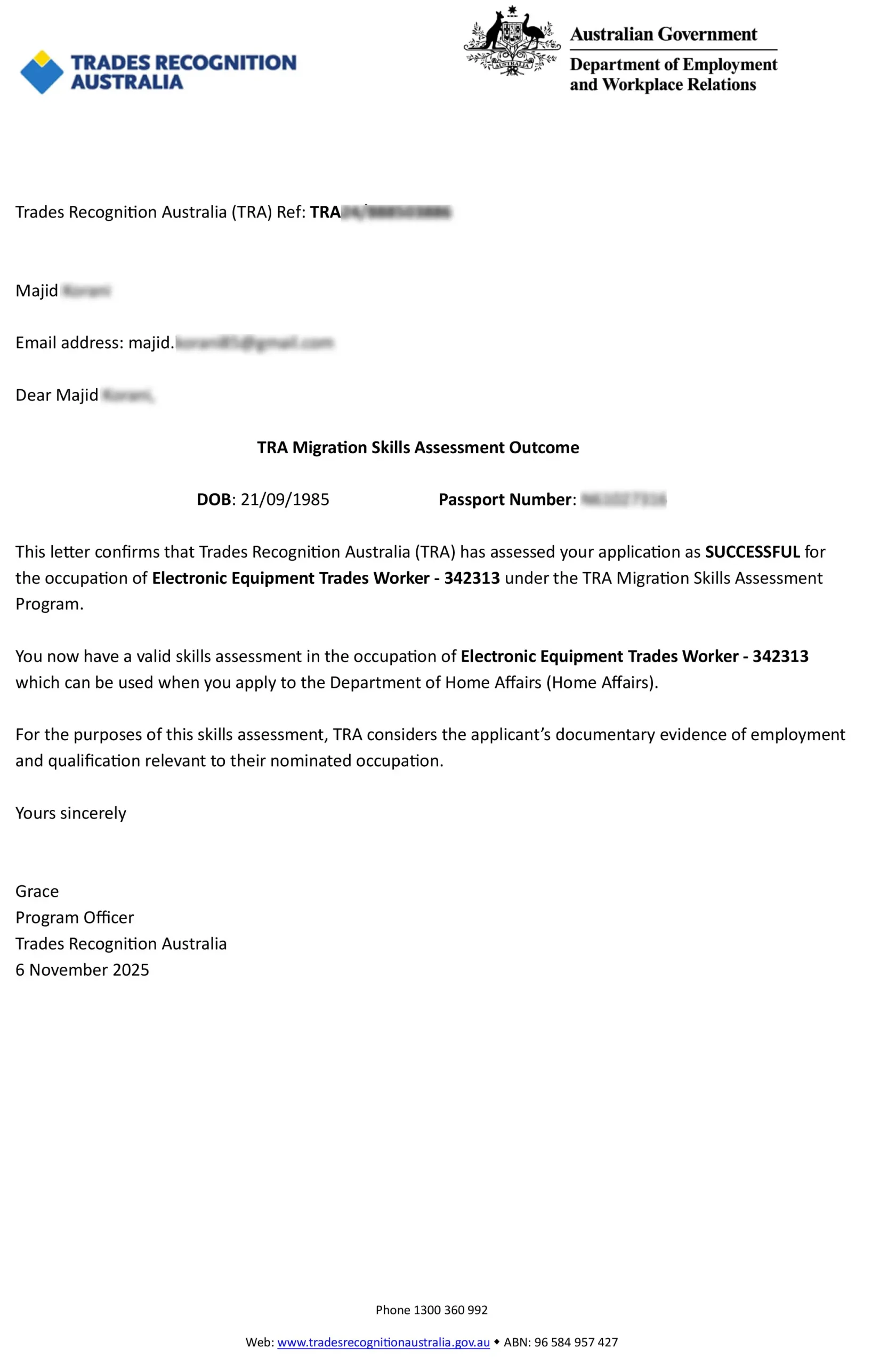 نمونه تائید صدور ویزای اسکیل ورکر استرالیا